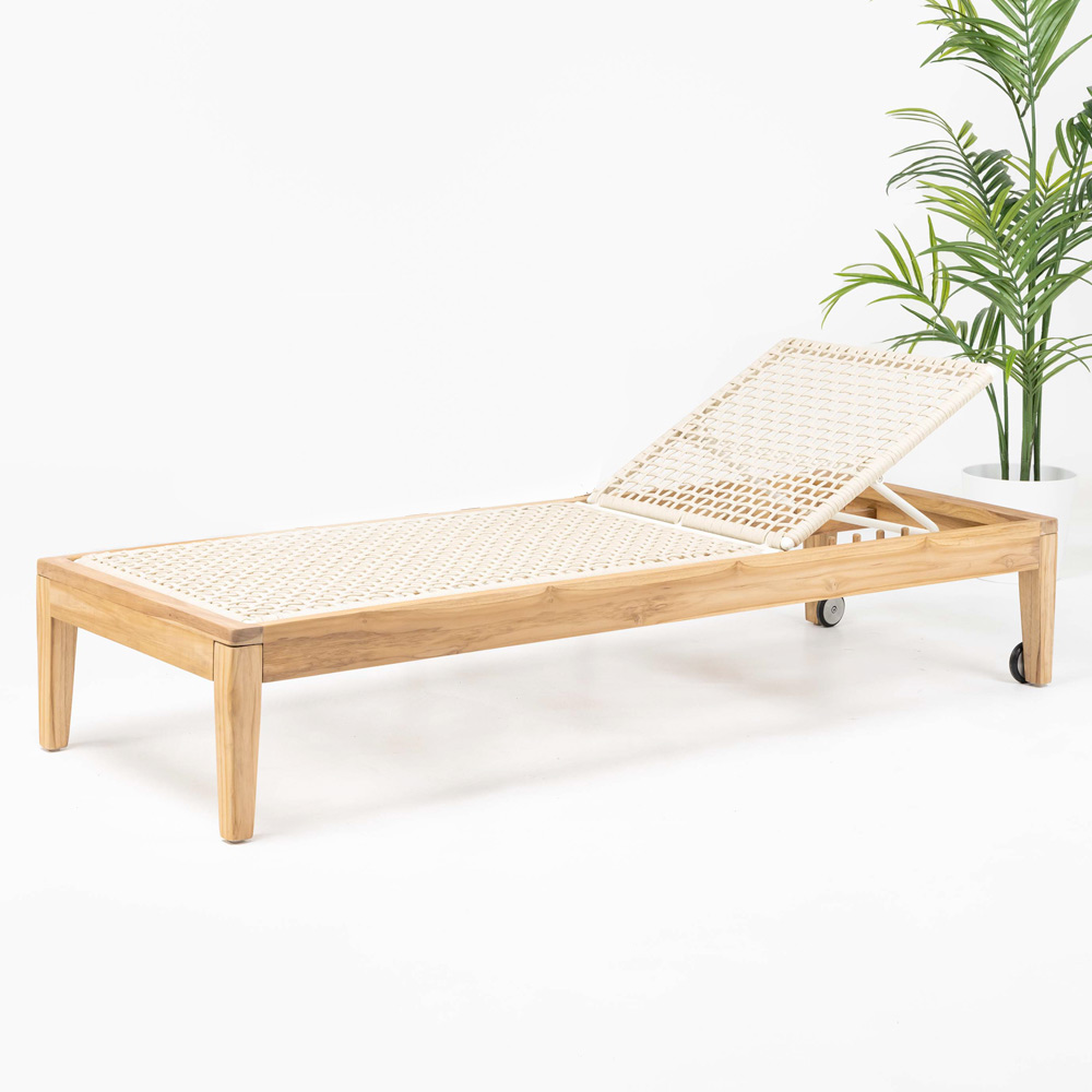 Udendørs liggestol i teaktræ og rebvævning.