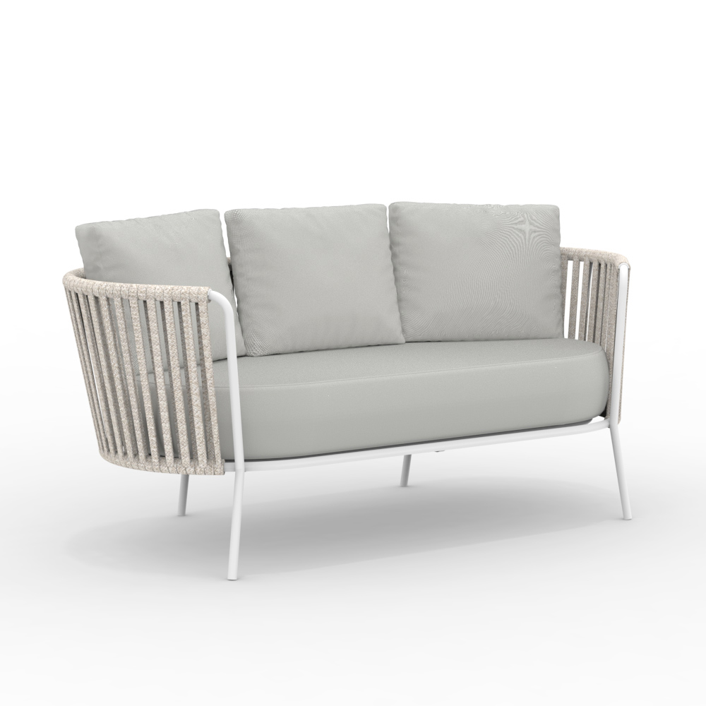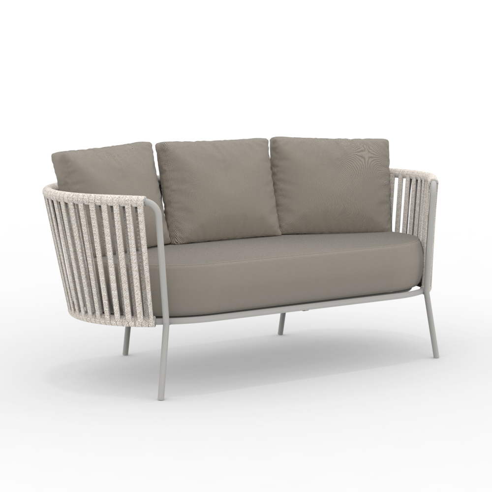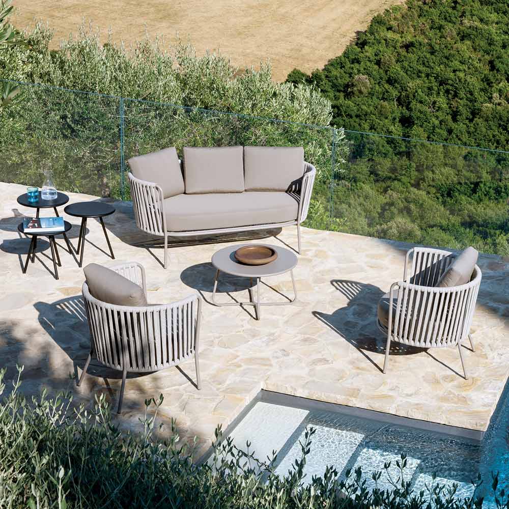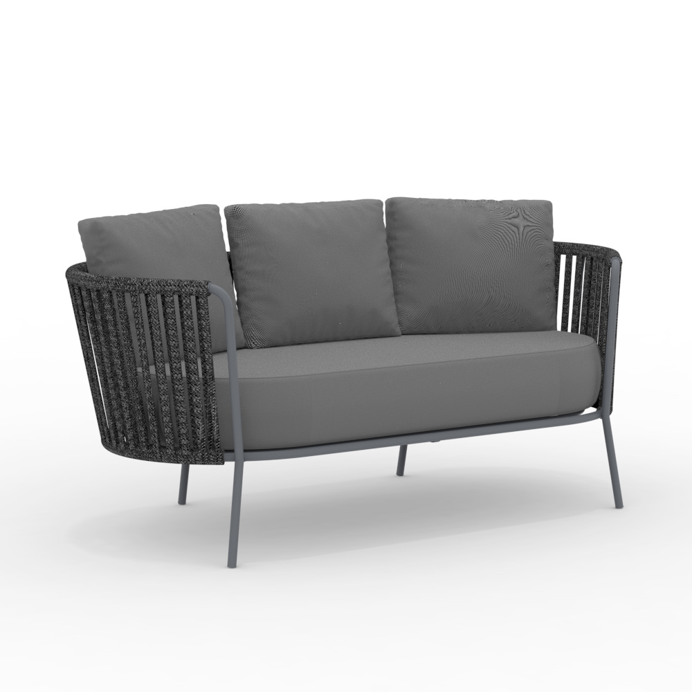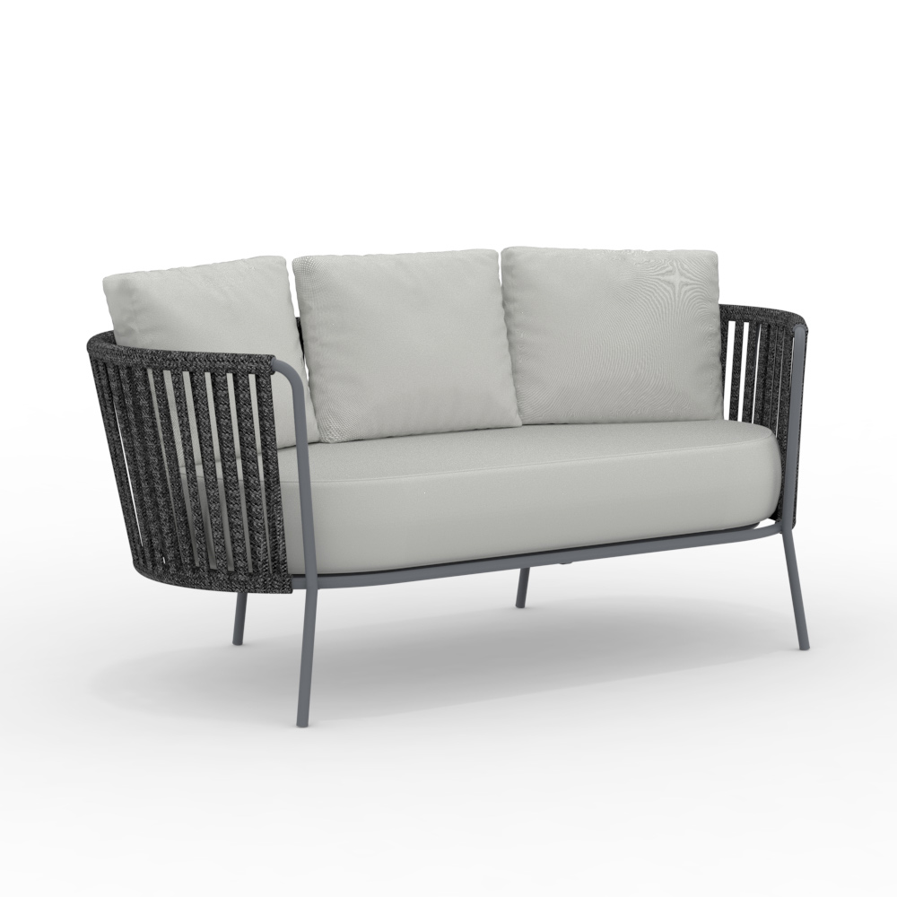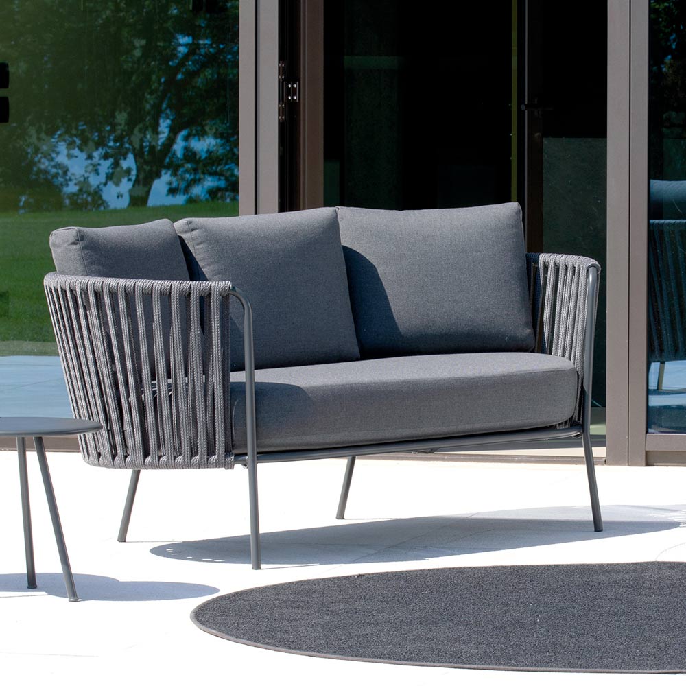 Strukturen i rustfrit stål garanterer soliditet og modstandsdygtighed over for atmosfæriske påvirkninger, mens rebvævningen giver et strejf af lethed og raffinement og omslutter sædet i en behagelig favn. Det ergonomiske design og de afrundede linjer sikrer en behagelig og afslappende siddeoplevelse.
