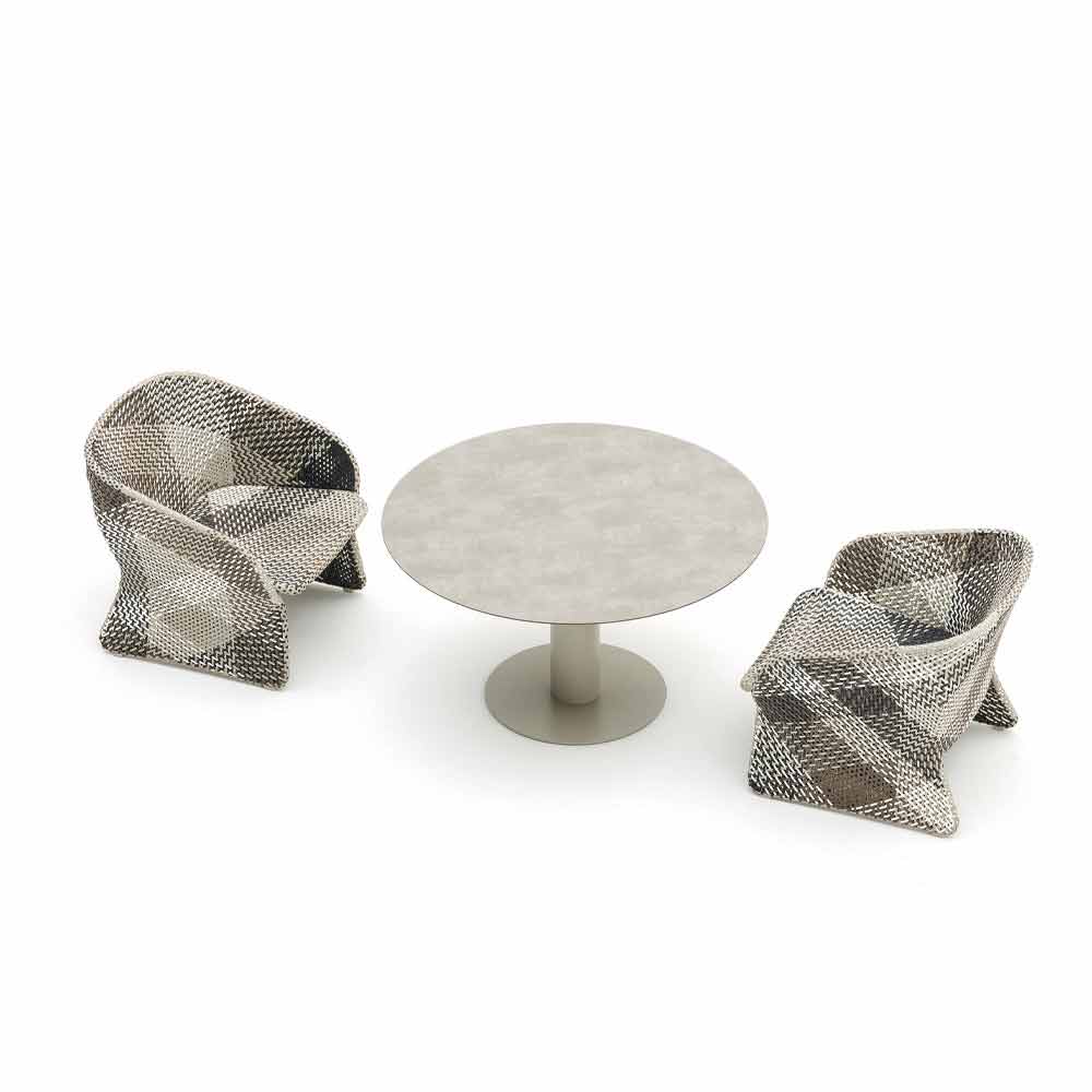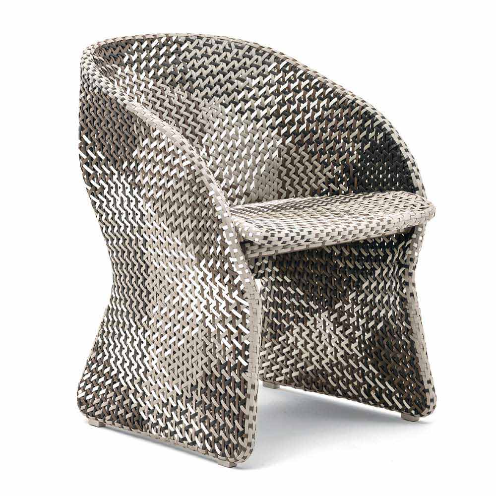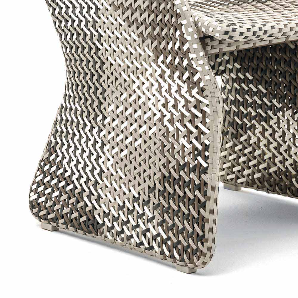 Moderne luksushaven lænestol i vævet syntetisk fiber med malet aluminiumsramme.