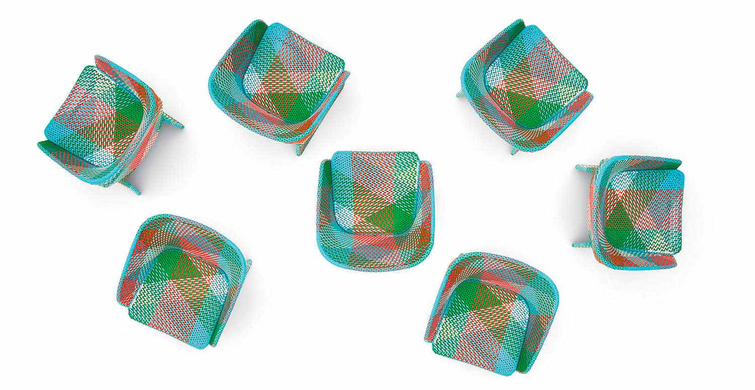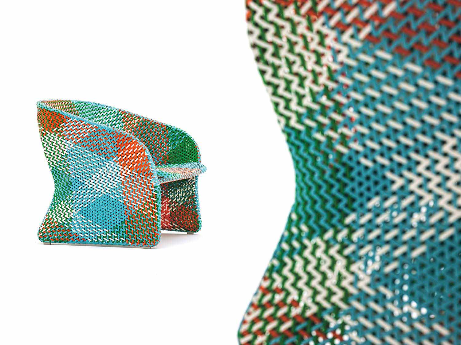 syntetiske fiberbånd krydser for at give form til vævningen af Maat-lænestolen. Vævet