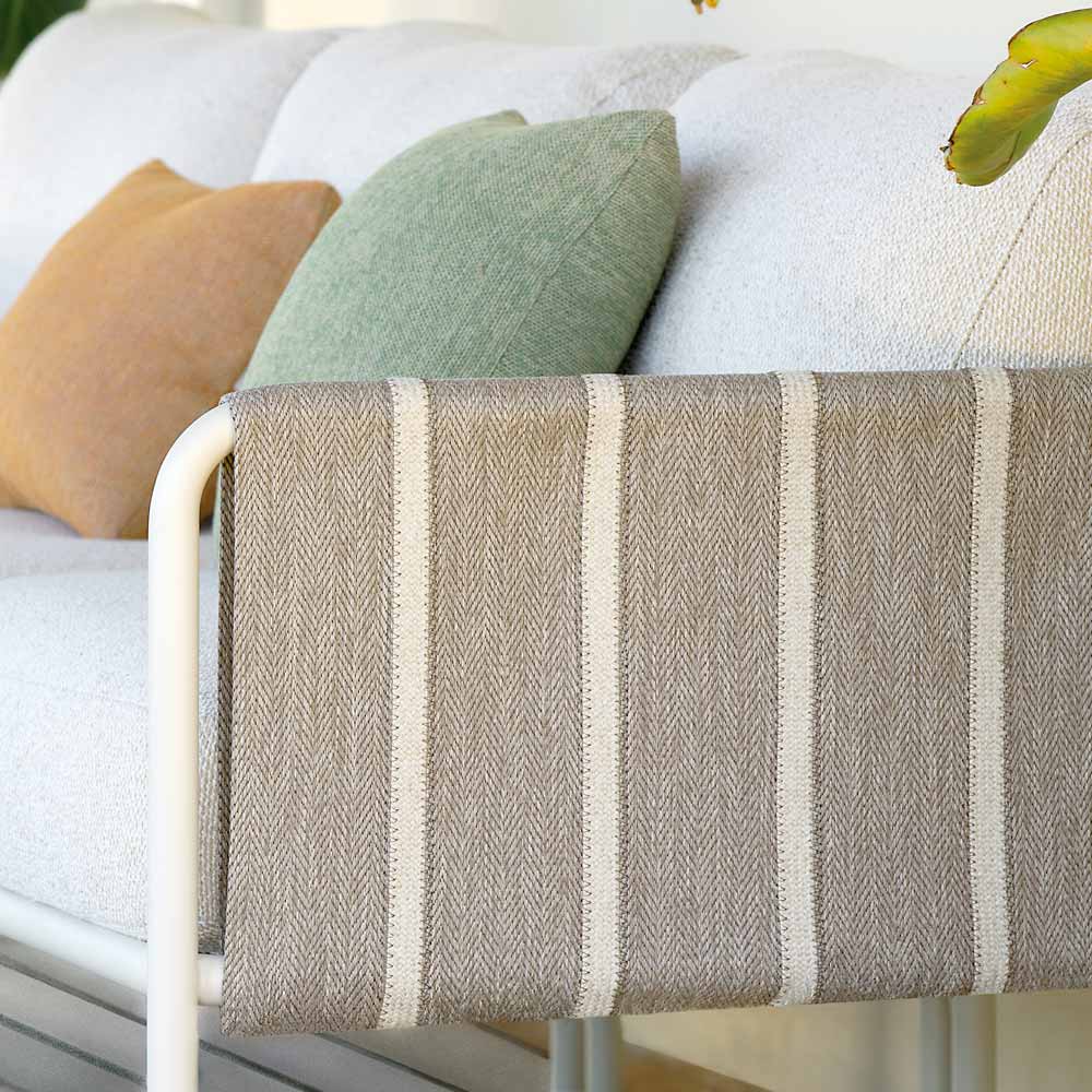 Lænestol: stel i galvaniseret jern pulverlakeret i perlehvid finish, sæde i elastisk bælte, hynder i hvidt stof og vaskbare og aftagelige armlænshynder.