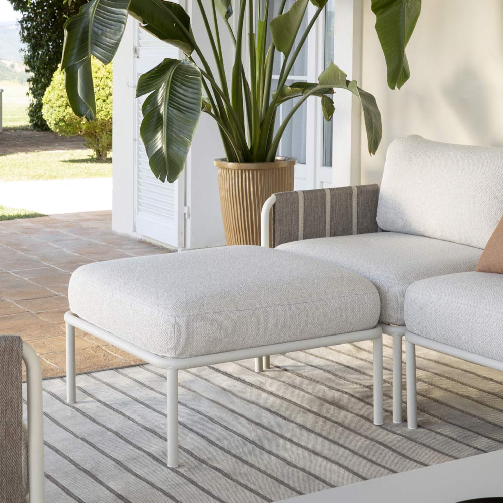 Sofa (2 hjørneelementer + 1 midterelement): struktur i pulverlakeret galvaniseret jern med perlehvid finish, sæde i elastisk bælte, hynder i hvidt stof og vaskbare og aftagelige armlænshynder.