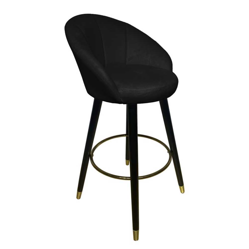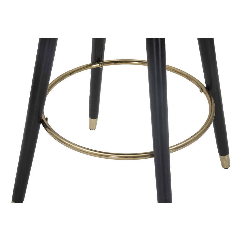 Moderne skammel i træ og jern med sæde beklædt med stof.