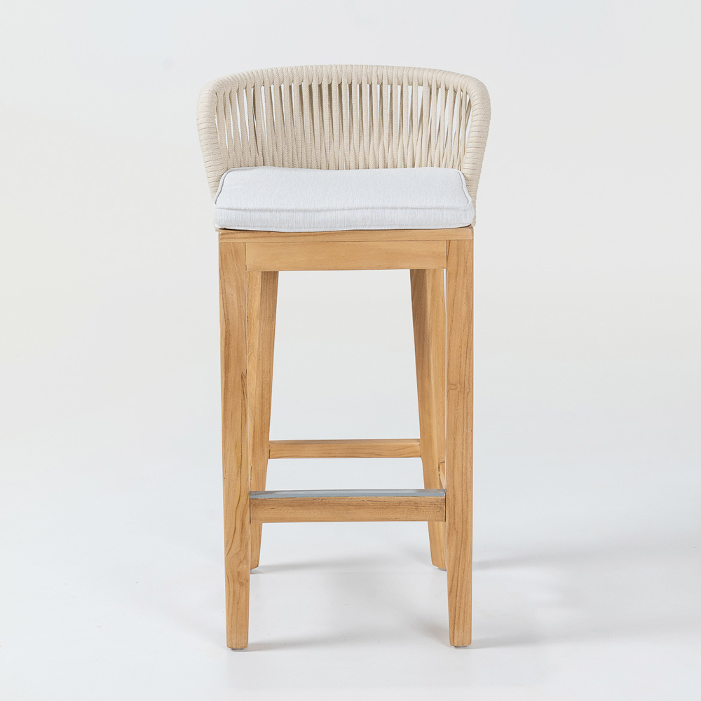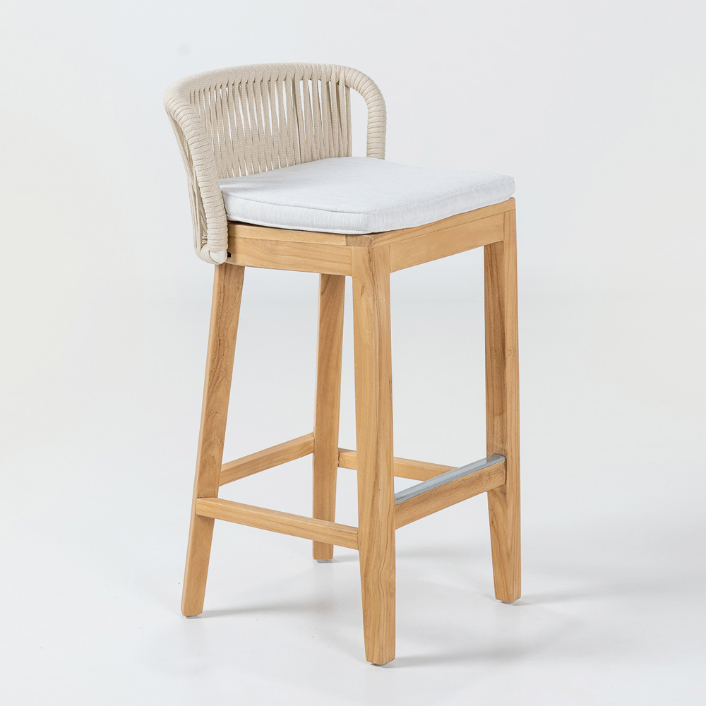 Denne barstol er elegant og alsidig og har en ramme i naturligt teaktræ og aluminium , der sikrer den perfekte kombination af styrke og lethed . Den grå Havana-stofhynde tilbyder fremragende komfort, mens Olefin/PP-rebvævningen ikke kun tilføjer et strejf af elegance , men også er vejrbestandig, hvilket gør den ideel til både indendørs og udendørs brug.