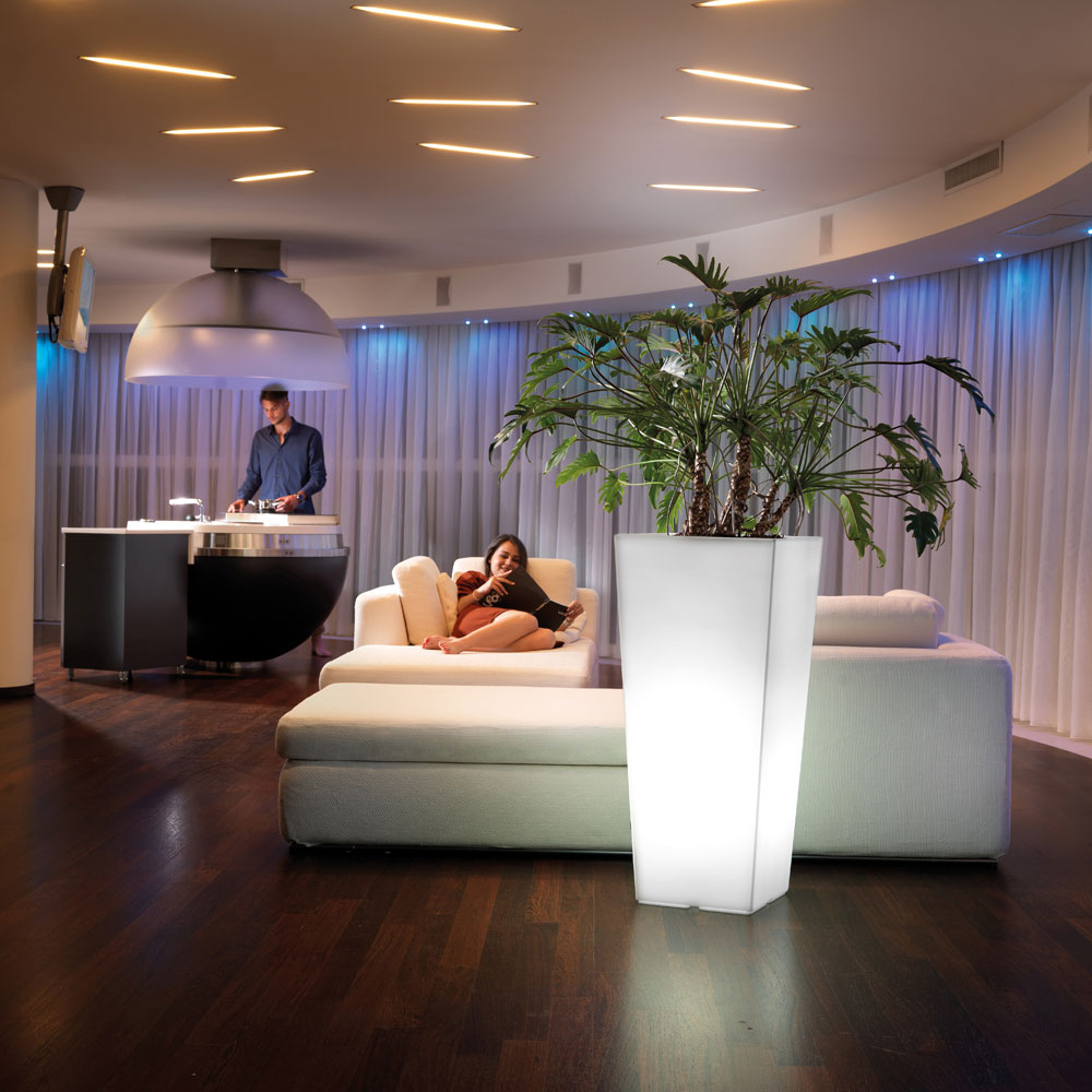 Denne indendørs lysende vase lavet i Italien i polyethylen fås i forskellige størrelser for at berige og revolutionere stilen i dit opholdsrum med ekstravagant karakter. De afgørende og væsentlige linjer giver et klassisk præg til dette indretningstilbehør, der fås i forskellige former og størrelser, uden dog at skjule dets elegance og funktionalitet .