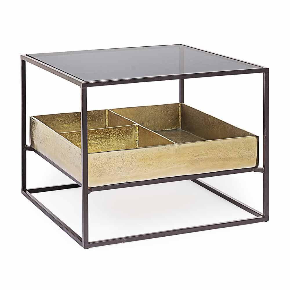 Sofabord i industriel stil med glasplade og stålkonstruktion.