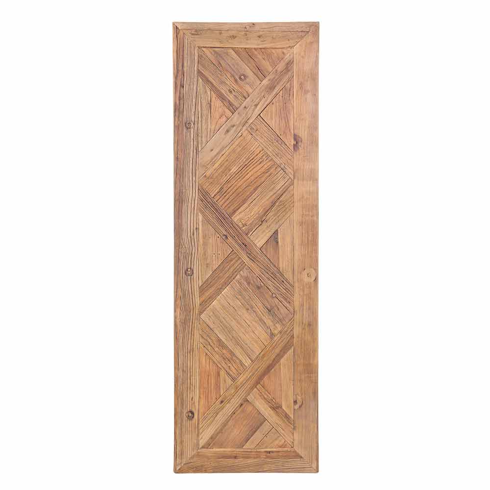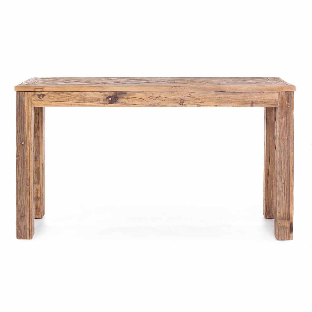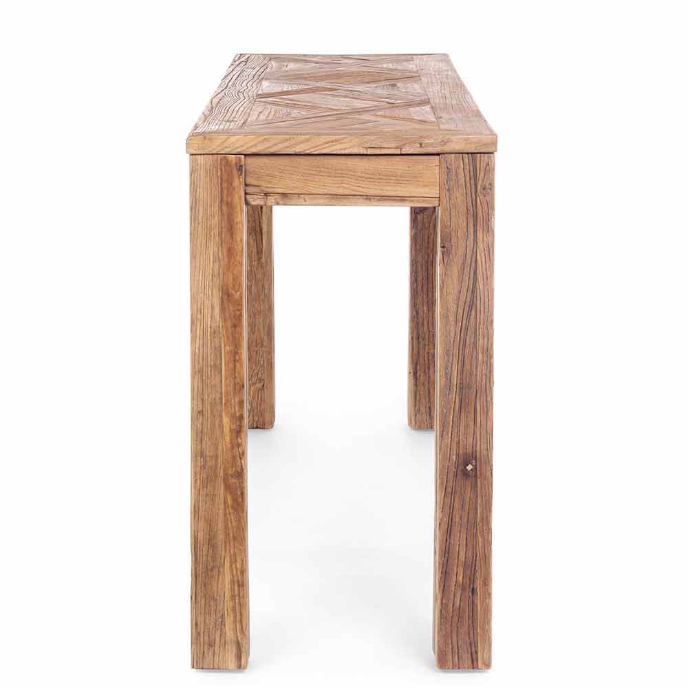 Denne designkonsol er udelukkende lavet af genbrugt almtræ med toppen dekoreret med en ældet parketfinish og en nitrocellulosebaseret finish.