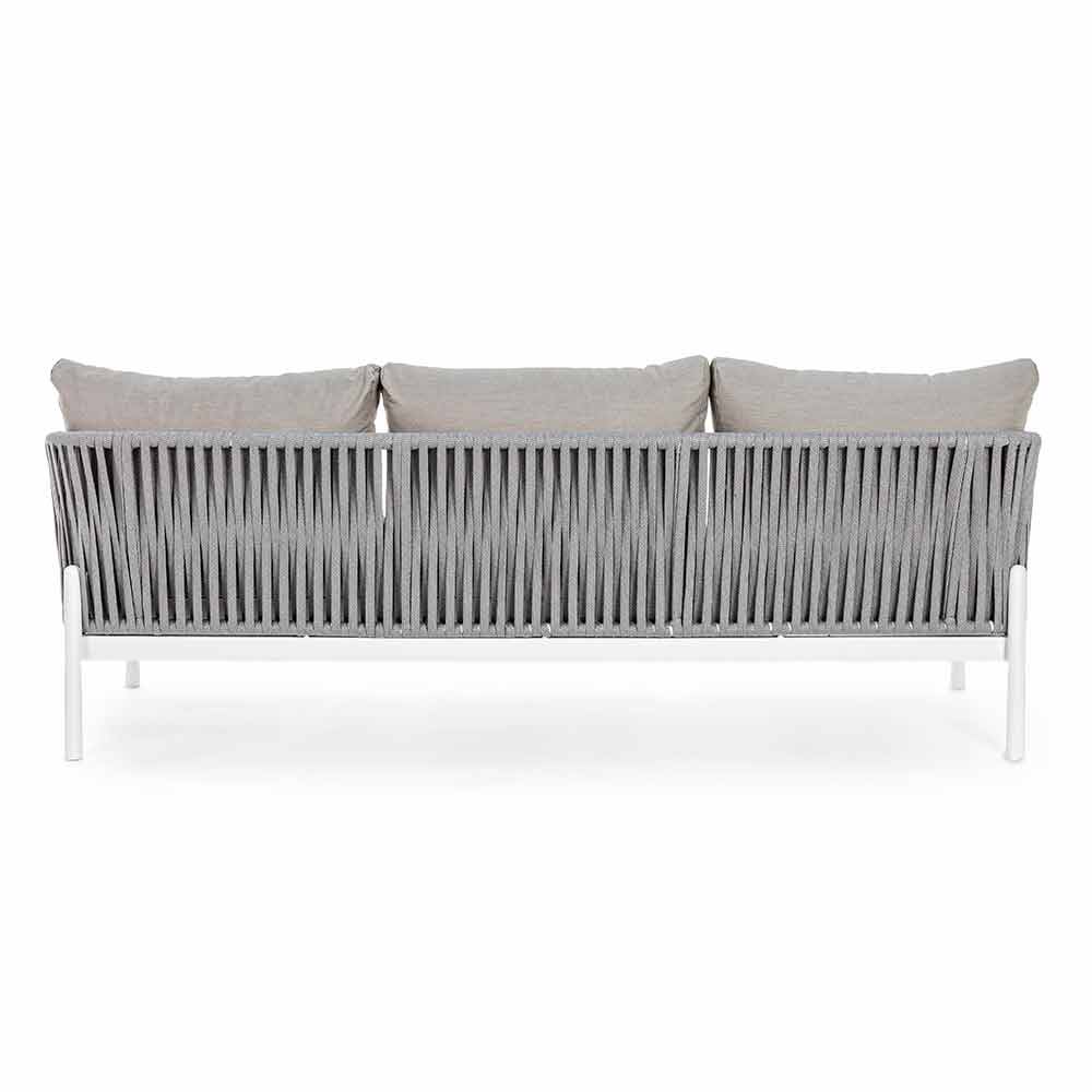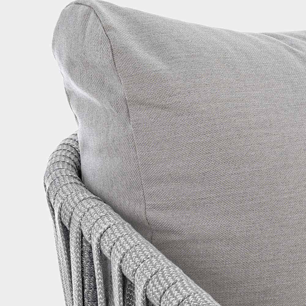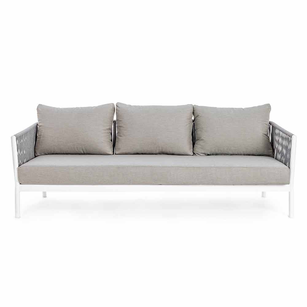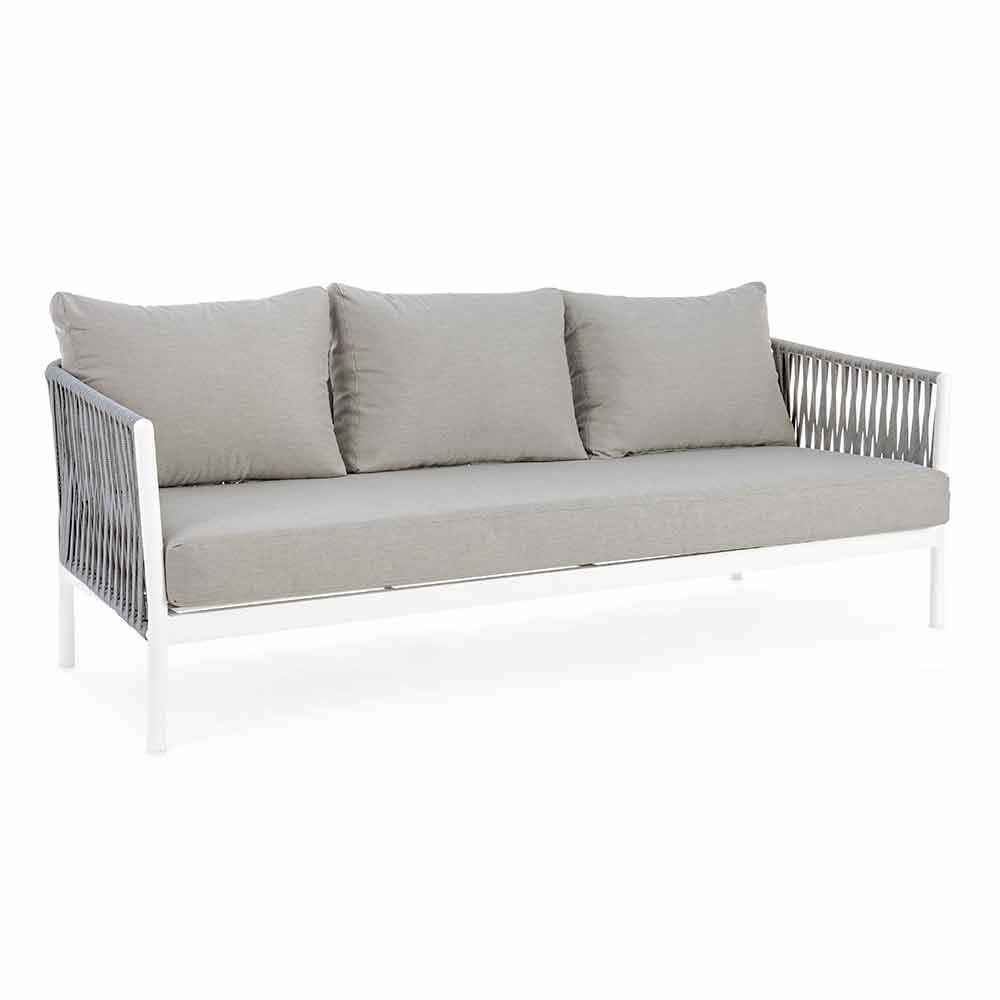 Udendørs sofa i moderne design i hvidt aluminium med rebvævning og grå hynder.