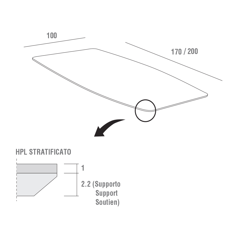 Køkkenbord med lagdelt hpl-plade (tykkelse 10 mm) lagdelt i tøndeform og understøttet på en mdf-plade og