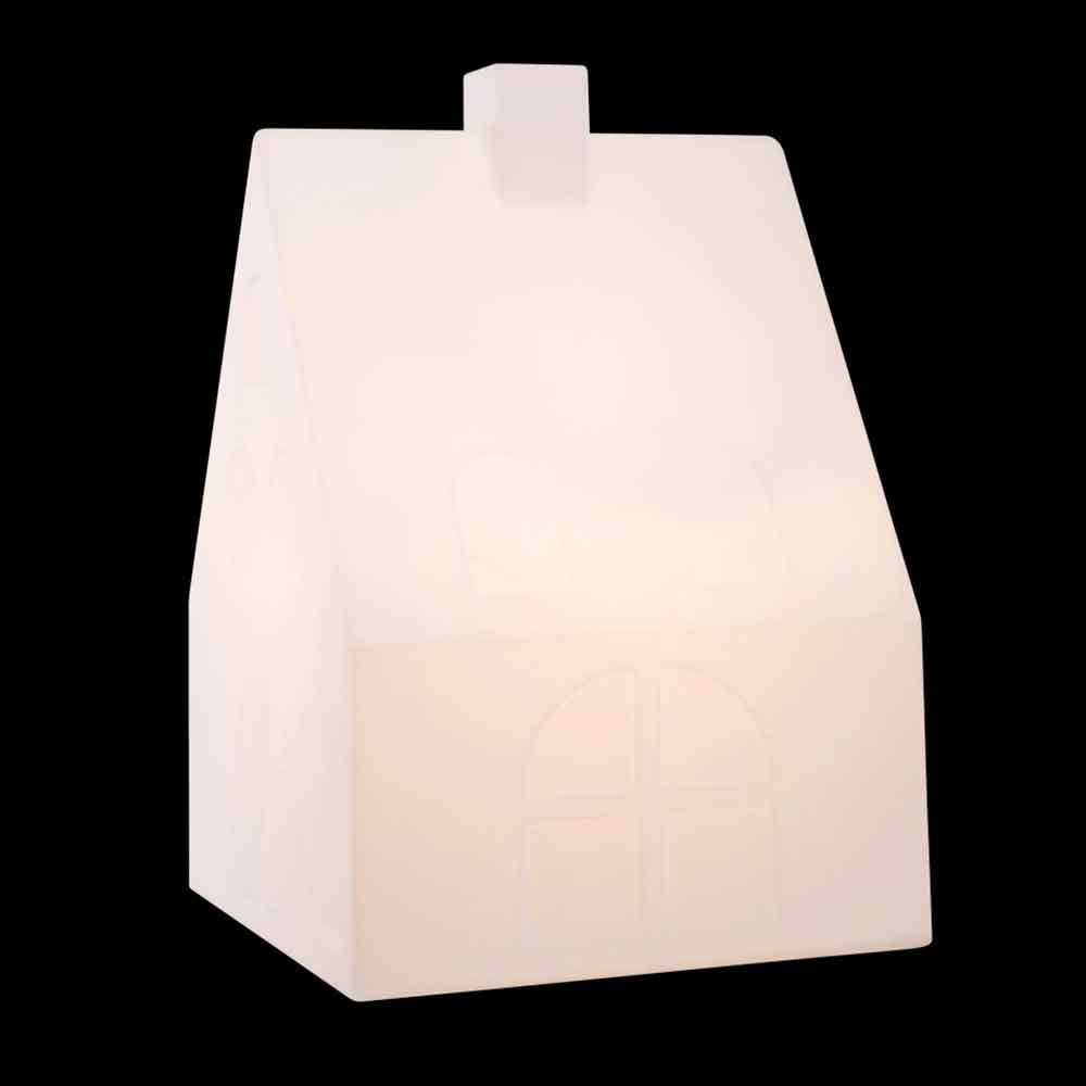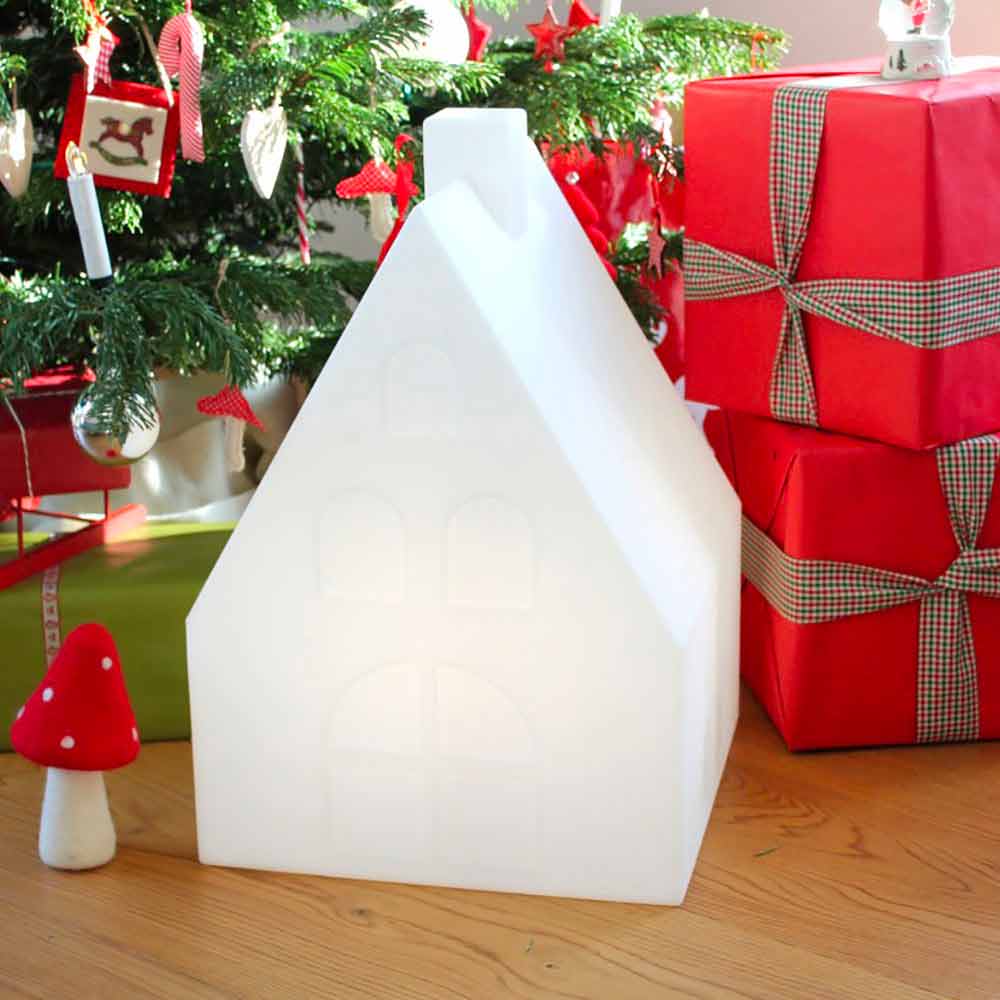 Husformet gulvlampe i hvid polyethylen, flerfarvet LED-tilslutning, sol eller E27 til indendørs eller udendørs.