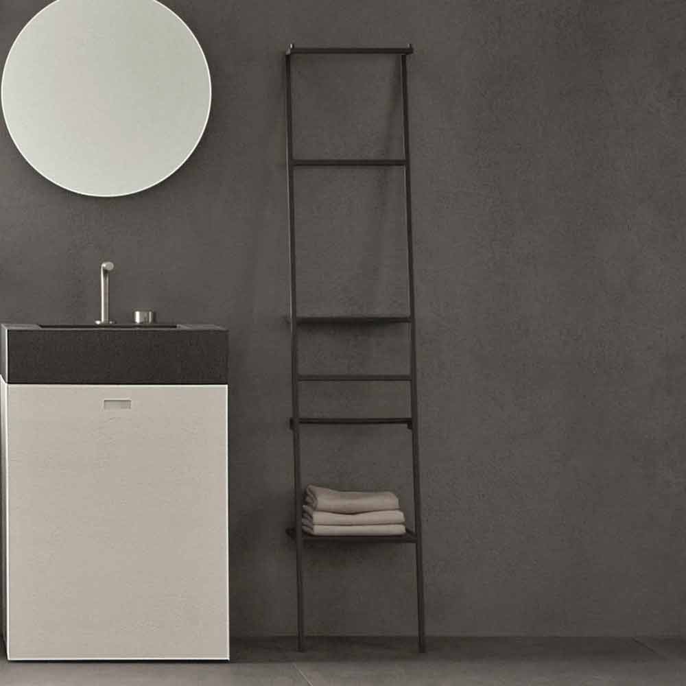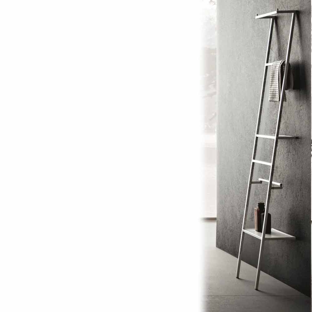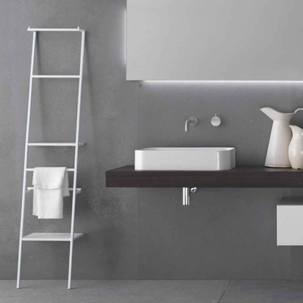 Hængestige i matlakeret metal med et minimalt og ekstremt funktionelt design. Den er udstyret med hylder, kroge til badekåber, rullestænger og håndklædeskinner.