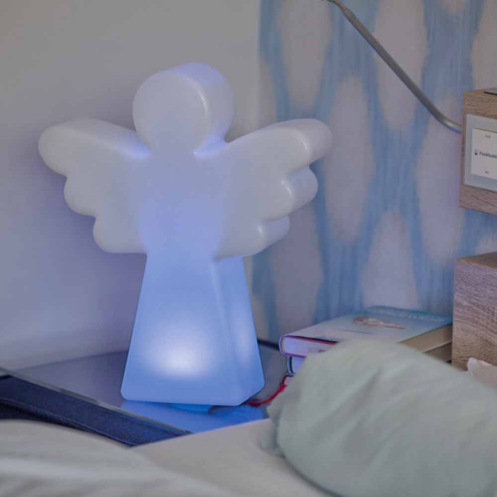 Bordlampe i hvid polyethylen, engelformet design med valg af tilbehør til indendørs eller udendørs.
