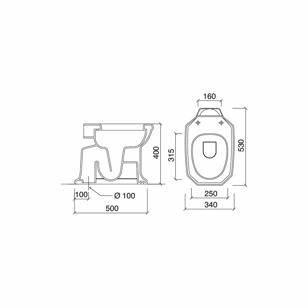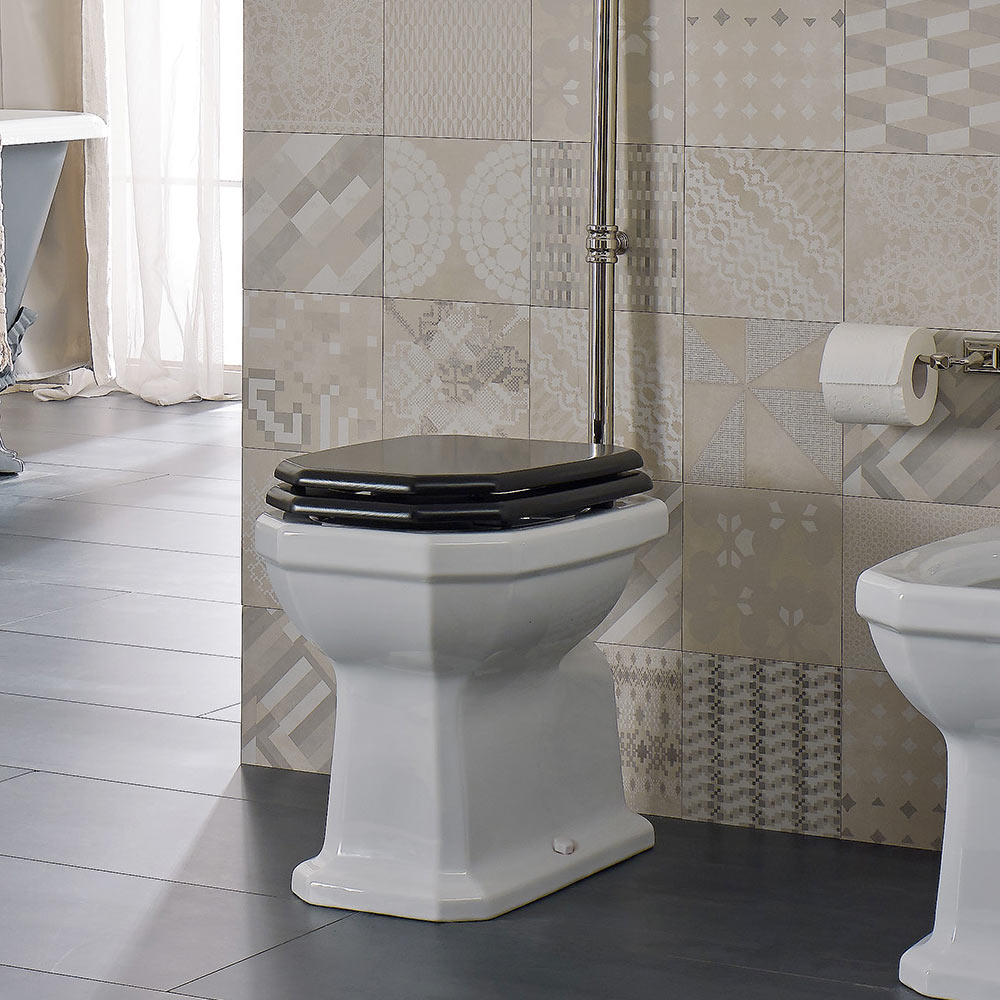 Fremstillet i Italien gulvstående hvid keramisk toiletskål med sort Nausica sæde.
