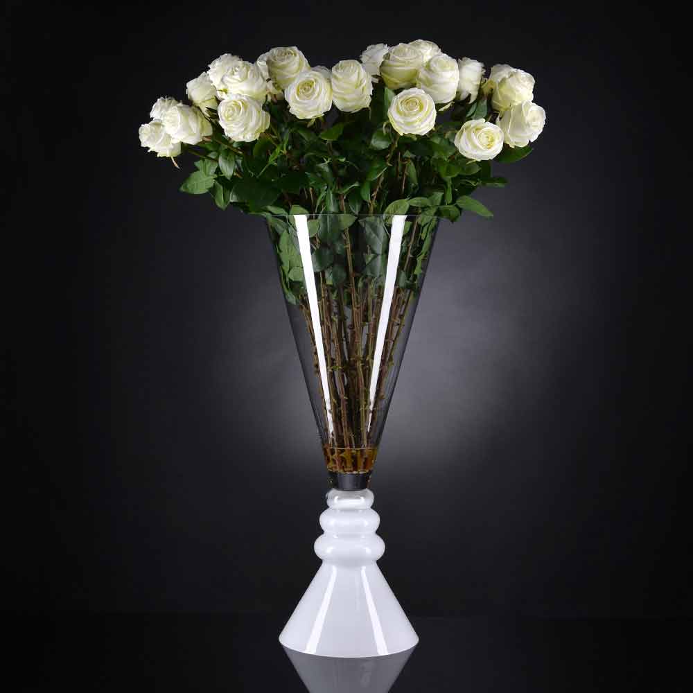 Indendørs vase i gennemsigtigt glas med hvid base lavet med 100% Made in Italy forarbejdning . Et supplement præget af en enkel og ren æstetik understreget af ekstrem elegance og alsidige finish, der gør det muligt at bruge det i ethvert miljø med en raffineret stil . Et ideelt design til de mest varierede miljøer, lige fra boligindretning til hoteller, restauranter, kontraktområder, kurbade, men også som ramme om begivenheder og bryllupper.