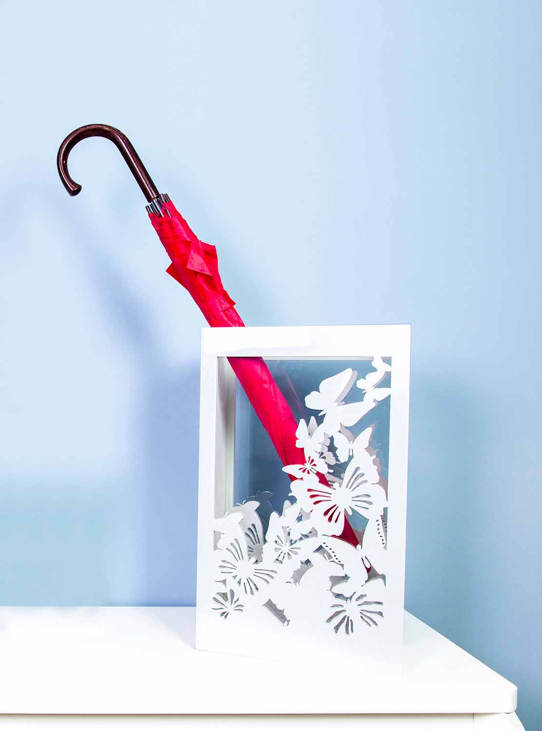 Paraply på gulvet er i hvidt, grus, due grå eller sandformet træ med et moderne design dekoreret med sommerfugle, fremstillet i Italien.