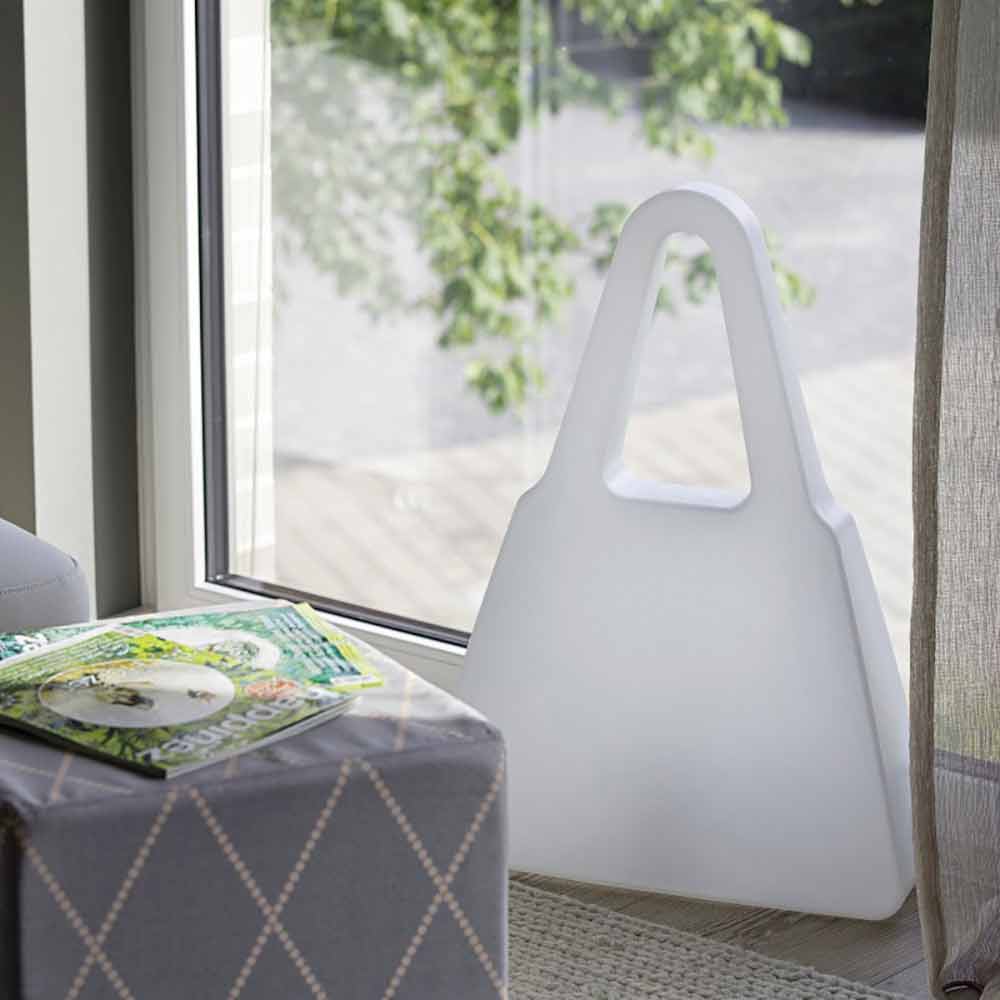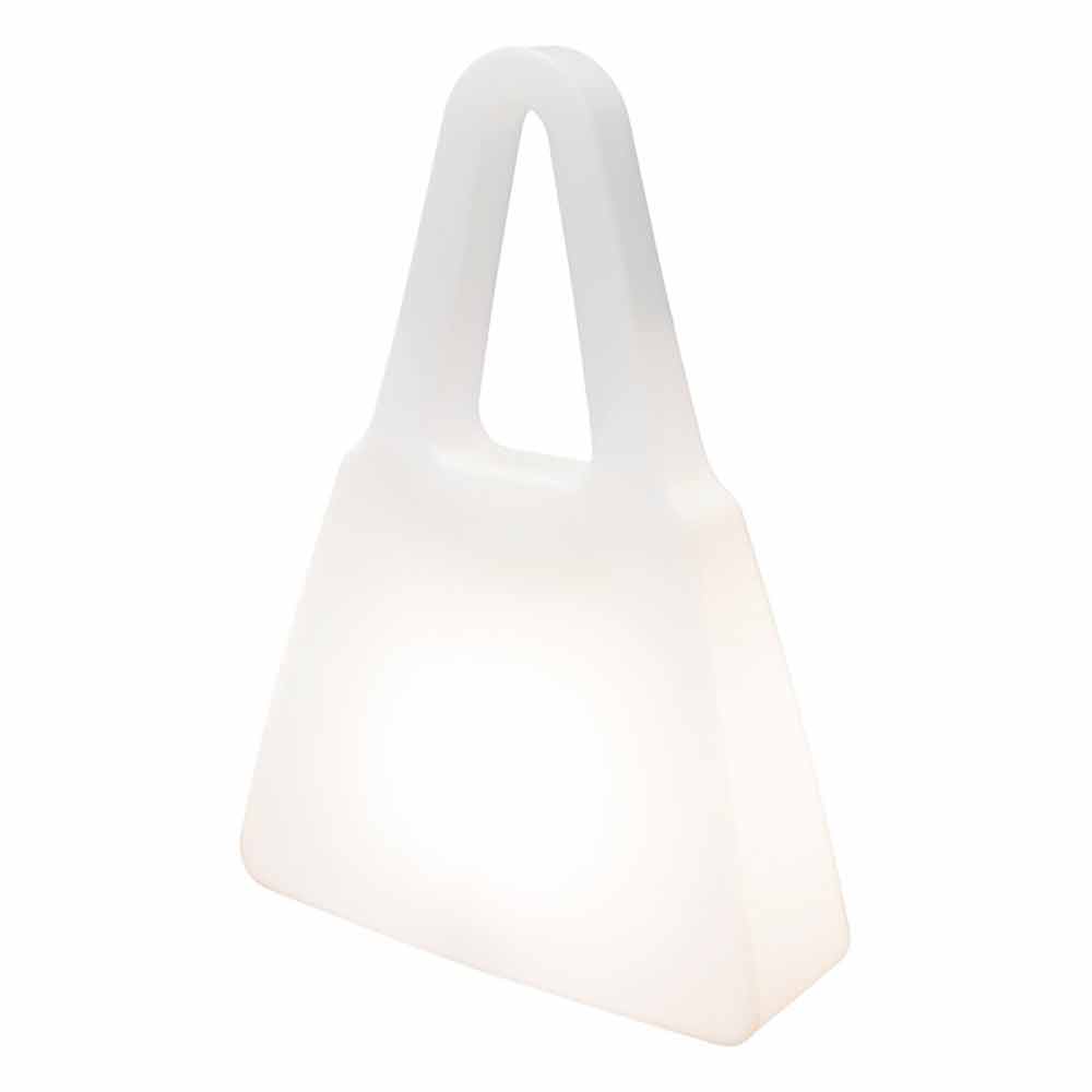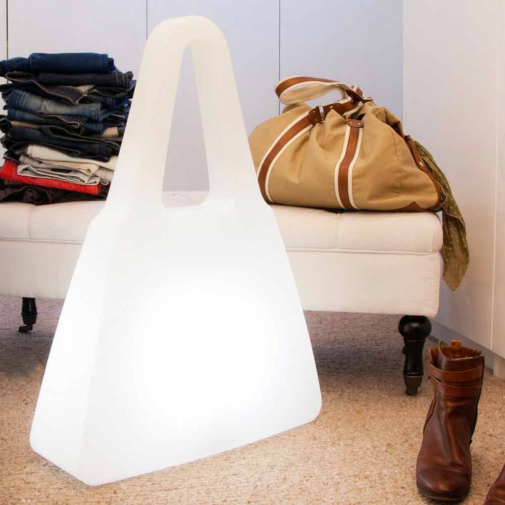 Taskeformet gulv- eller bordlampe, moderne design i polyethylen med LED-, sol- eller E27-forbindelse.