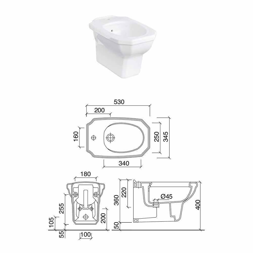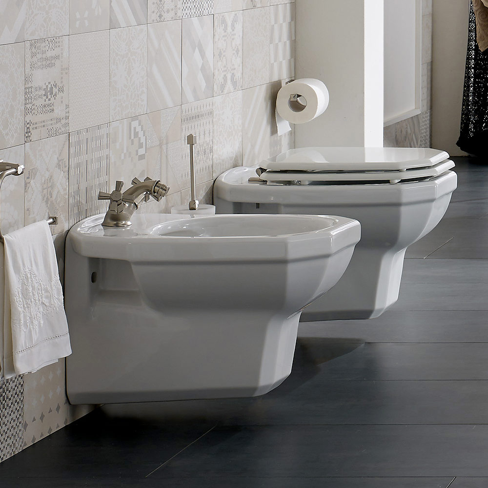 Væggehængt bidet fremstillet i Italien i hvid keramik, klassisk stil, Nausica.