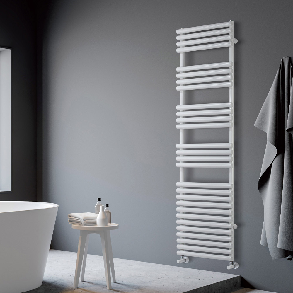 Hydraulisk håndklædetørrer i kulstofstål med en ren hvid blank finish bestående af en række vandrette elementer med en diameter på 3,5 cm svejset på lodrette manifolde med en diameter på 3,5 cm, fremstillet i Italien med vægmonteringssæt, udluftningsventil og blindkappe inkluderet . Dette element fremstilles på fabrikken i Treviso, kun få kilometer fra Venedig, hvilket garanterer al den kvalitet og effektivitet, der kendetegner Made in Italy. Viden og stræben efter innovation i processer og produkter danner grundlaget og værdierne for skabelsen af et produkt, der kombinerer banebrydende teknologi og design , æstetisk skønhed og funktionalitet.