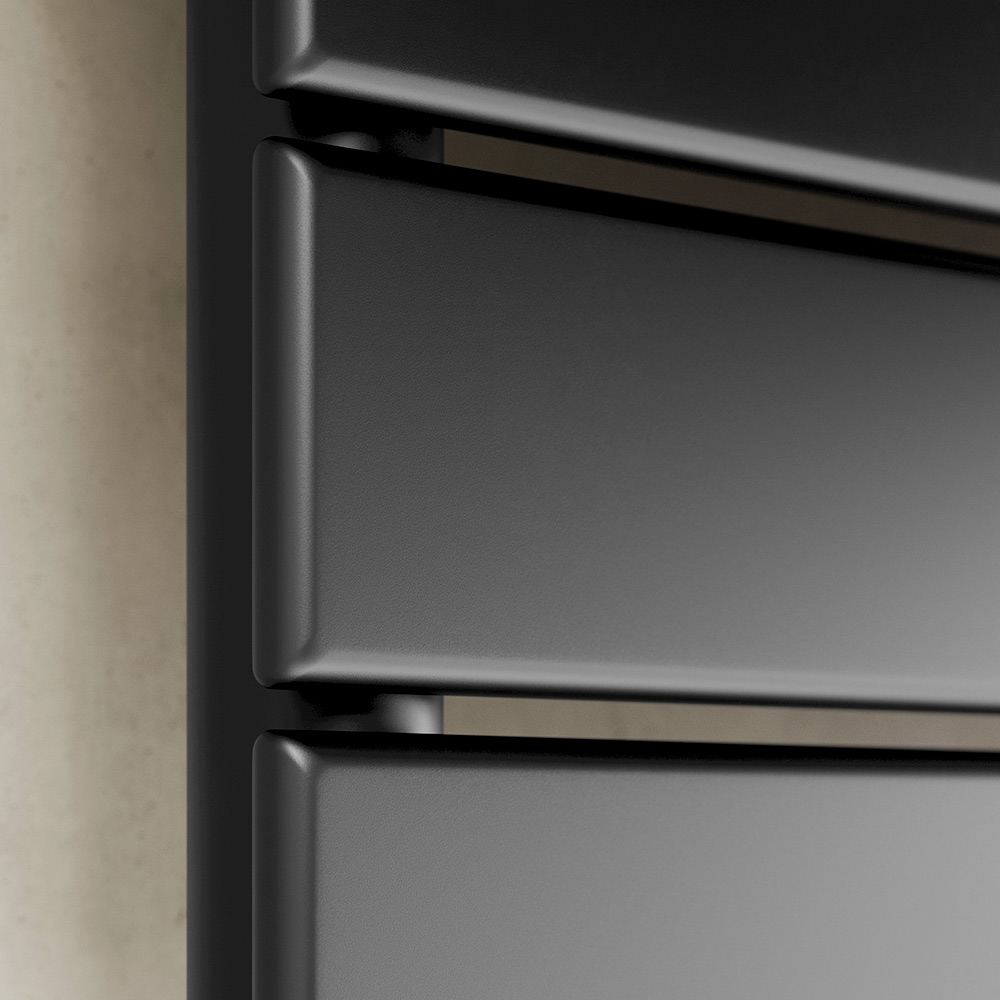 Denne sorte håndklædevarmer repræsenterer ren elegance og sofistikering i alle detaljer. Dets moderne design og rene geometriske linjer tilføjer et strejf af moderne stil til ethvert badeværelse og integreres perfekt med forskellige dekorationsstile, fra den mest minimalistiske til den mest vovede.