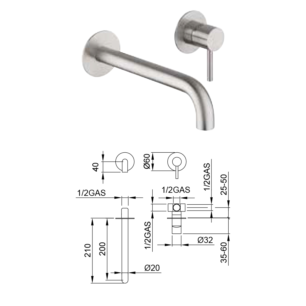 Indbygget håndvaskarmatur med vægmonteret tud, uden spild, lavet af