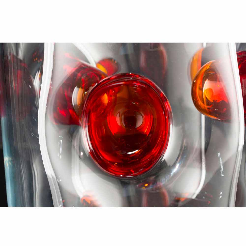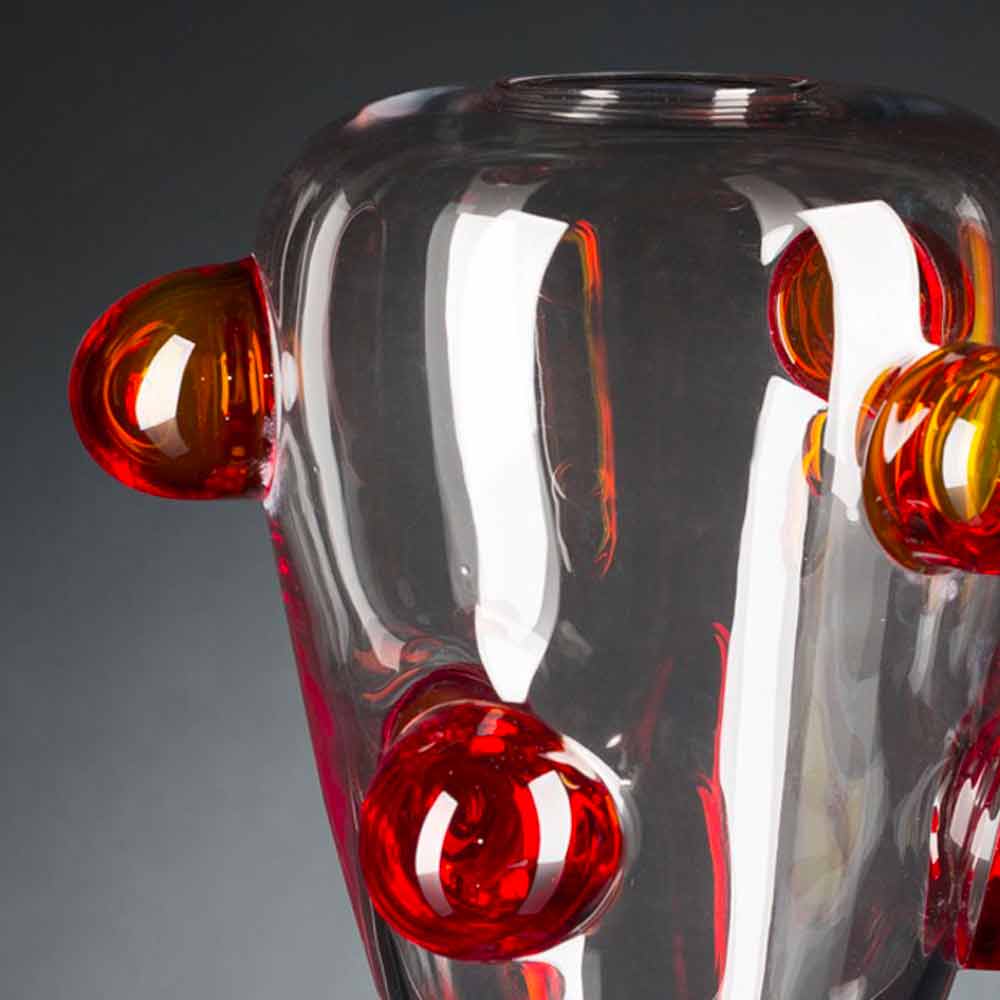 Elegant indendørs vase lavet af gennemsigtigt Murano-blæst glas med røde detaljer gennem en proces helt lavet i Italien . Et komplement, der kombinerer den ekstreme elegance af Murano-glas og dets vidunderlige træk med et moderne og livligt design for at give liv til en idé om eksklusive og avantgardistiske møbler, der kan berige ethvert hjemligt rum og ikke med et strejf af farve . En ideel stil til de mest varierede miljøer, lige fra boligindretning til hoteller, restauranter, kontraktområder, kurbade, men også som ramme om begivenheder og bryllupper.