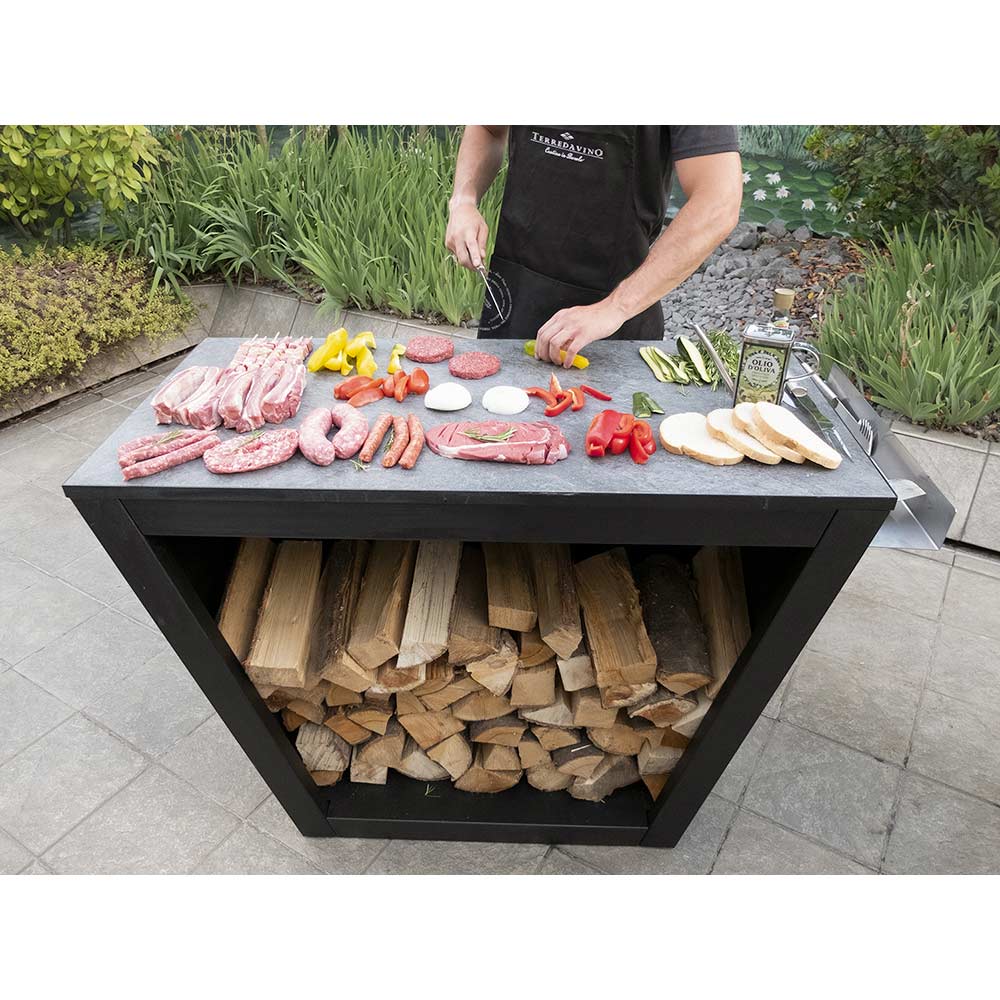 4 justerbare fødder i rustfrit stål. Bordpladen i porcelæn stentøj er 90 cm høj og giver dig et ekstra rum, hvor du kan tilberede kød og grøntsager til dit køkken eller grill.