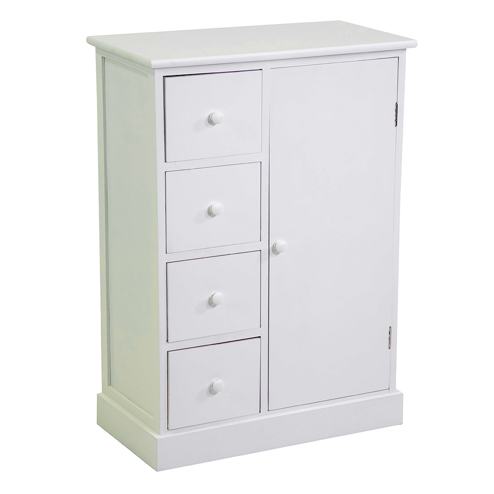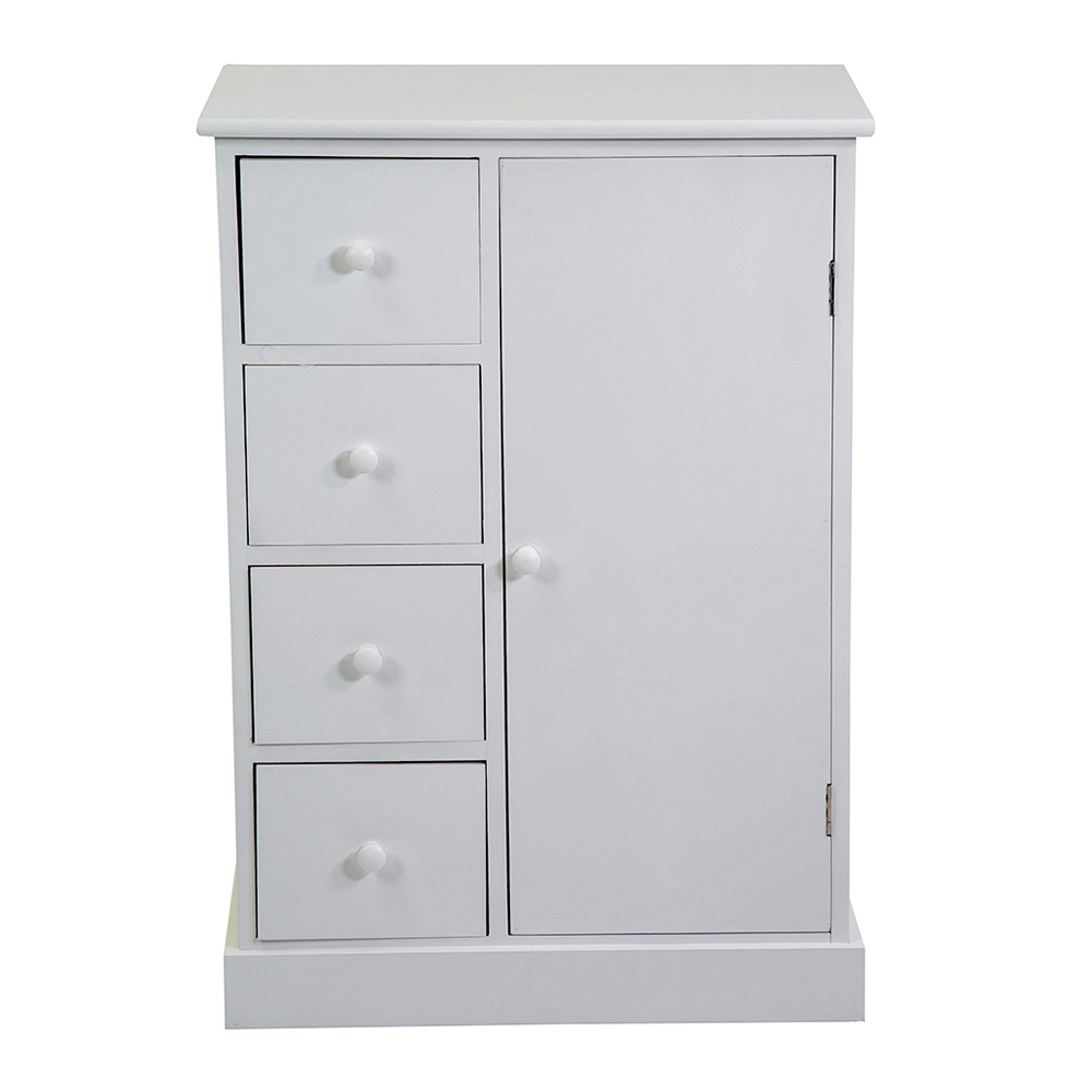 Med 4 sideskuffer og 1 dør tilbyder det en stor opbevaringsløsning, der er perfekt til opbevaring af hverdagsting, redskaber, tekstiler eller dokumenter, så alt holdes ordentligt og ude af syne. De rene linjer og det minimale design gør det ekstremt anvendeligt: perfekt til stuer, soveværelser, badeværelser eller entréer.