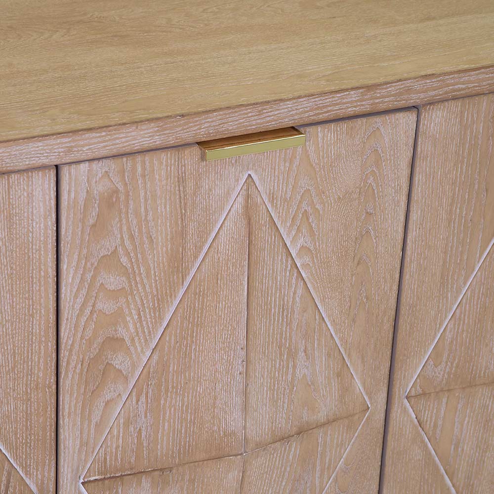 De fyrretræsben giver skabet en solid struktur, beriget med et rent og moderne design. Dørene, der er udsmykket med et indgraveret geometrisk mønster, tilføjer et strejf af originalitet og raffinement.