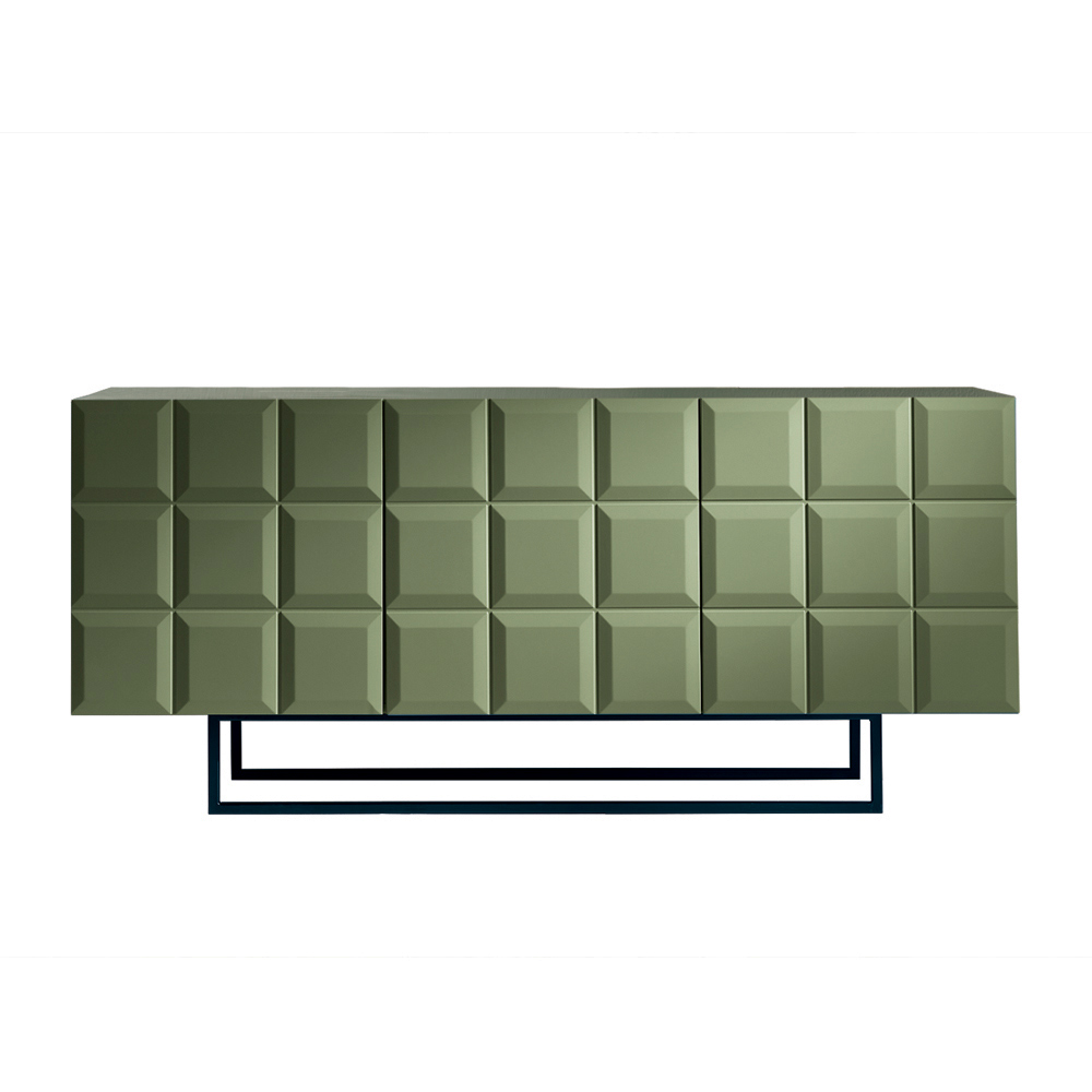 Det melaminbelagte kabinet kombineres med en malet metalbase , der fås i forskellige konfigurationer, hvilket strømliner strukturen og giver visuel lethed. Skænken kan suppleres med en spejlblank glasplade for en endnu mere sofistikeret effekt.