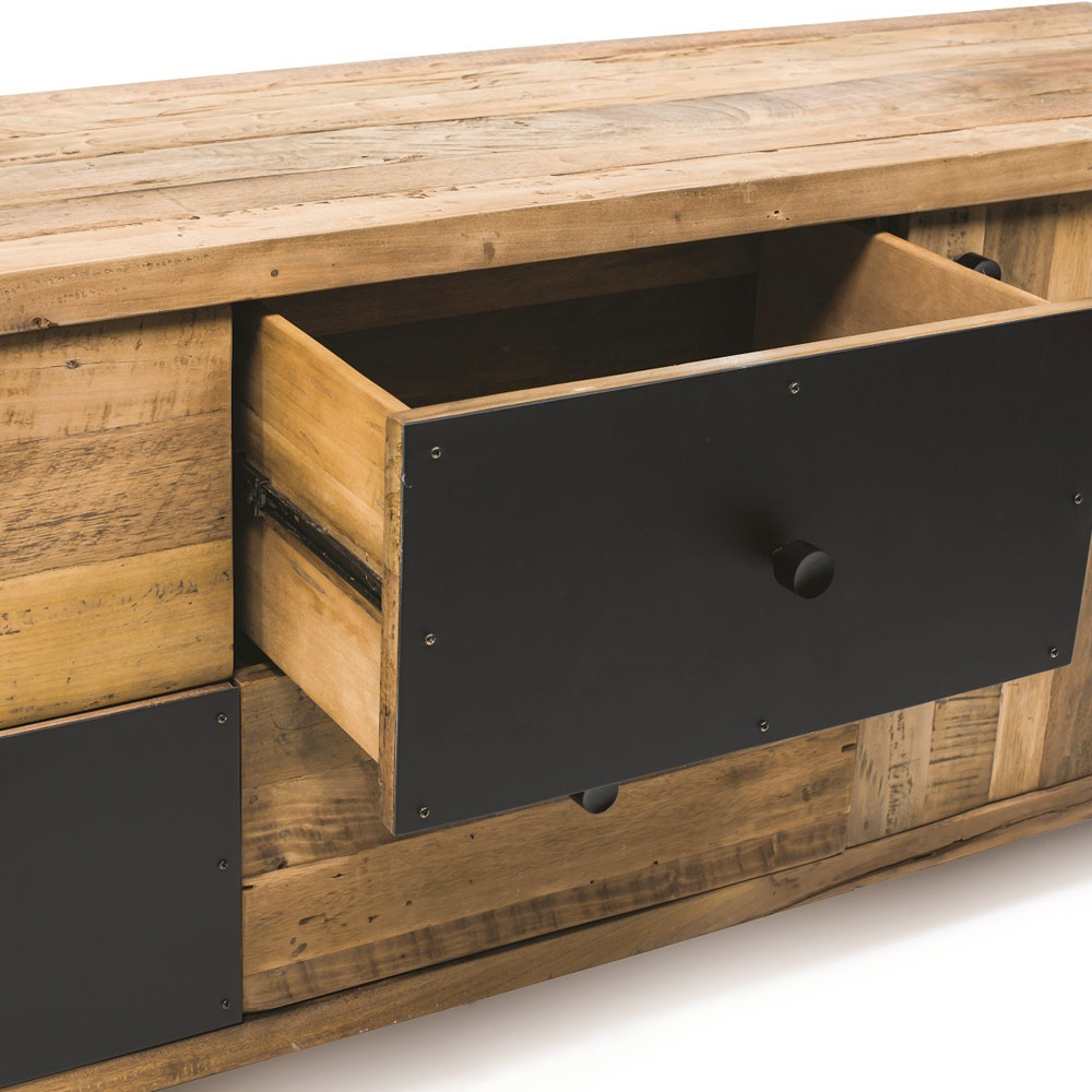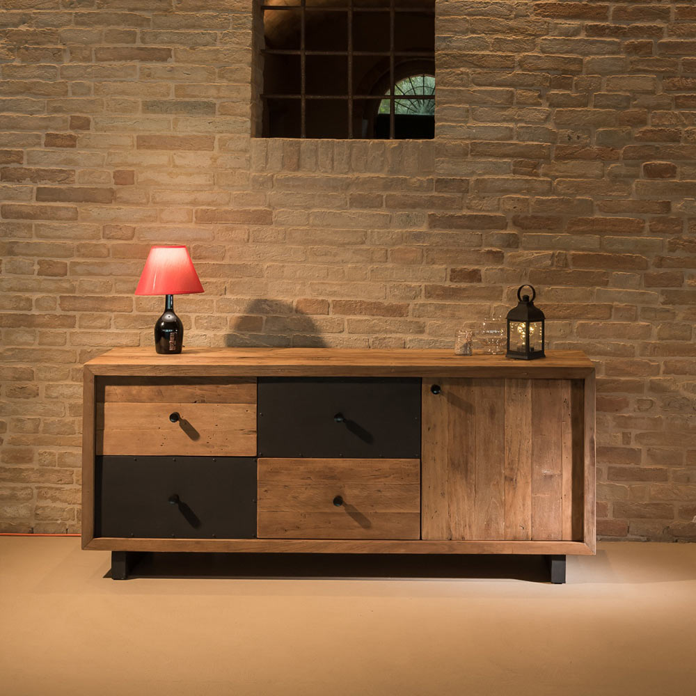 Indendørs skænk lavet af naturligt kaffefarvet genbrugstræ med 1 låge, 2 frontskuffer i træ, 2 frontskuffer i sort metal og metalfødder.