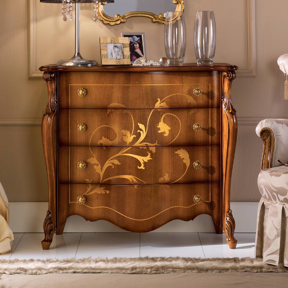 Kommode i klassisk stil lavet af Bassano valnøddetræ med 4 praktiske og rummelige skuffer og elegante indlæg. Et unikt og raffineret supplement, fuldstændig fremstillet i Italien af dygtige håndværkere , kunstmestre, der afslutter hvert komplement med visdom og smag for elegance. Produktionen udføres ved hjælp af fine materialer og udfører arbejdet i hånden med den største omhu og professionalisme, der kendetegner Made in Italy- produkter.