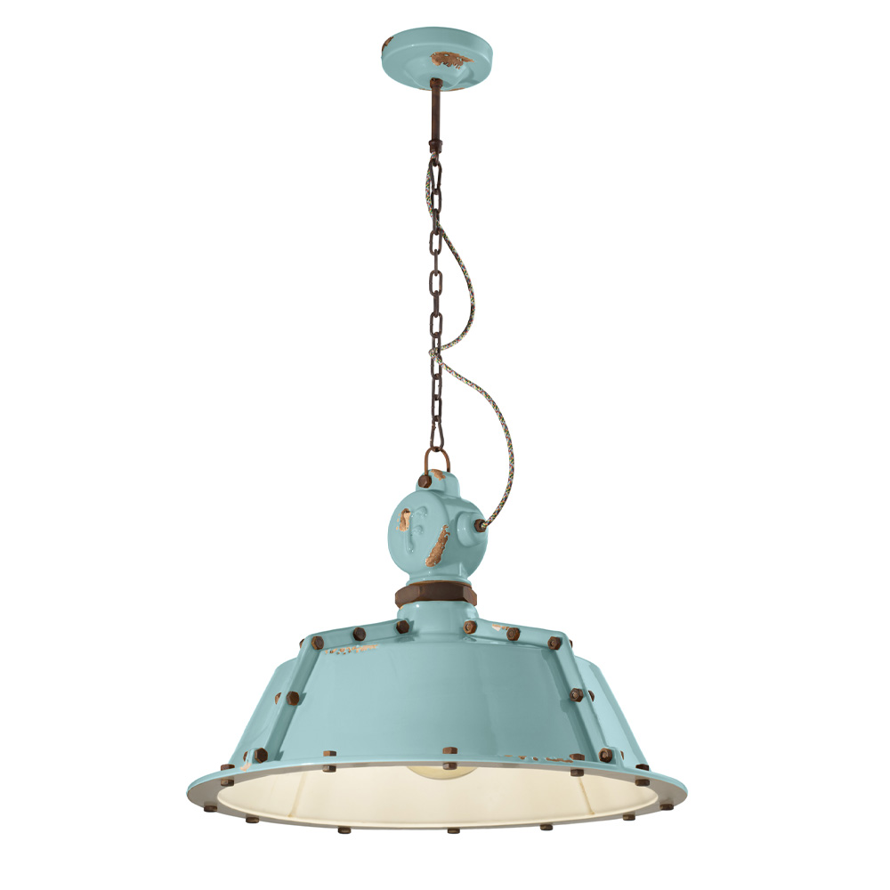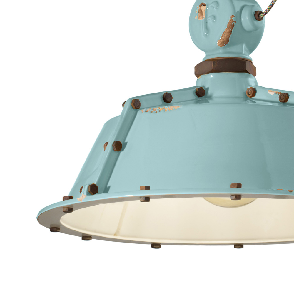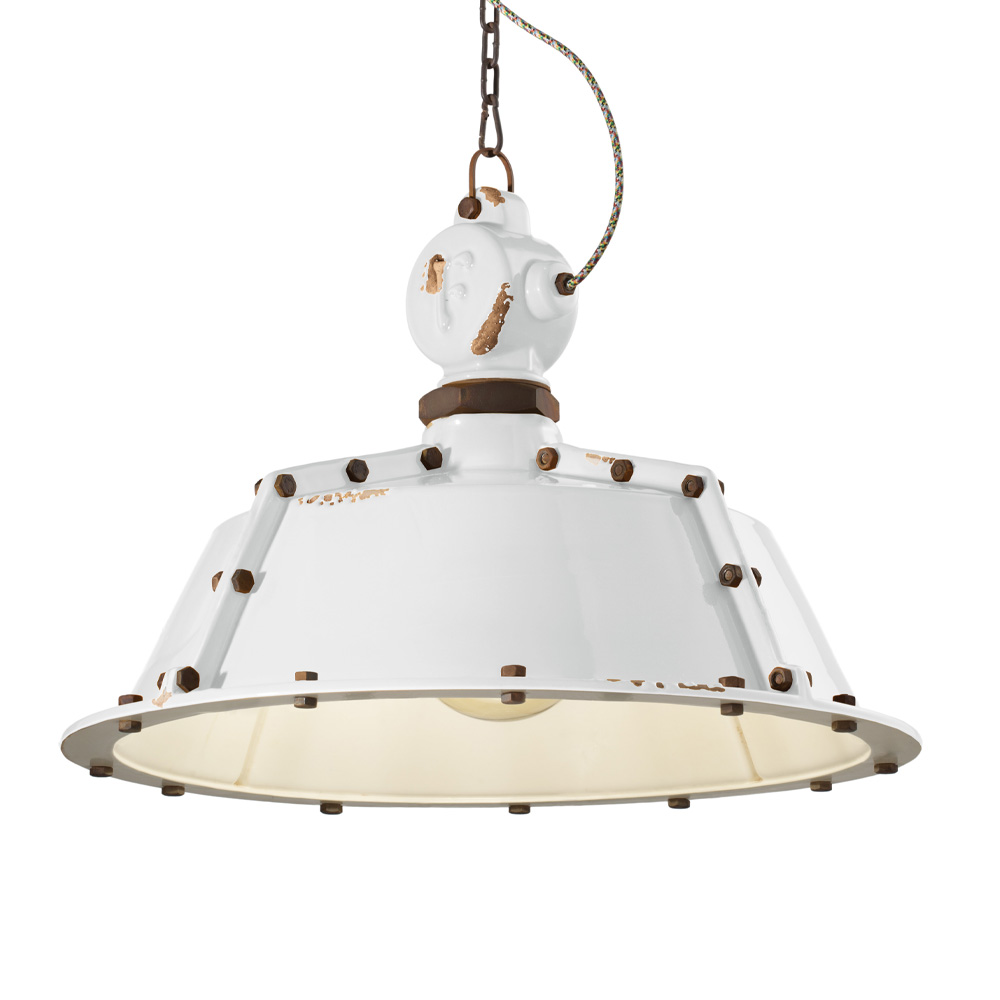 Håndlavet ophængt lampe i keramik og jern, industrielt design lavet i Italien af Ferroluce.