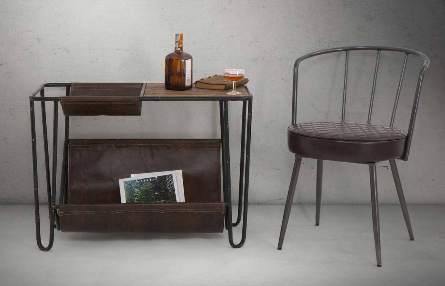 Moderne lænestol i industrielt design i jern og øko-læder.