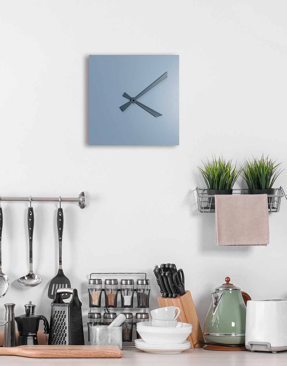Avio og blå firkantet vægur, moderne design i træ, lavet i Italien.