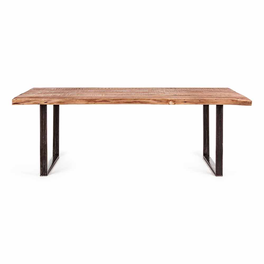 Spisebord i industriel stil med akacietræplade og stålbund.
