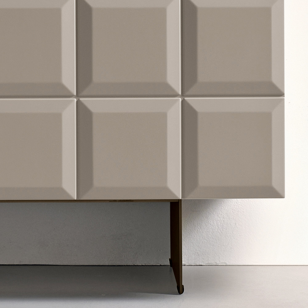 Det melaminbelagte kabinet kombineres med en malet metalbase , der fås i forskellige konfigurationer, hvilket strømliner strukturen og giver visuel lethed. Skænken kan suppleres med en spejlblank glasplade for en endnu mere sofistikeret effekt.