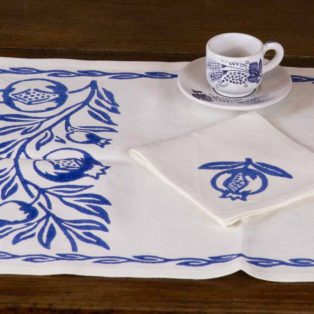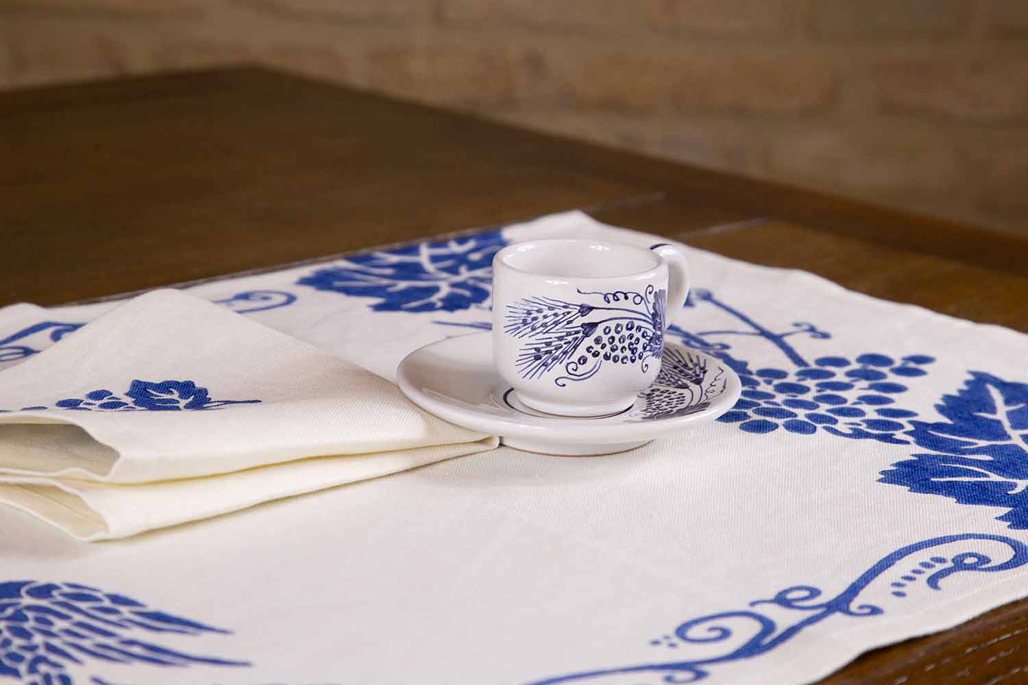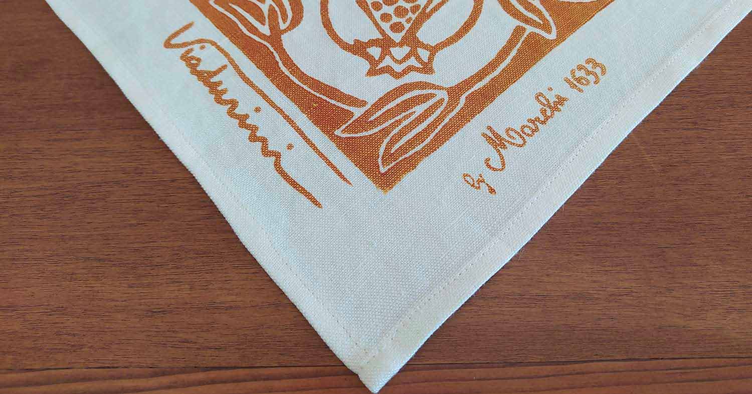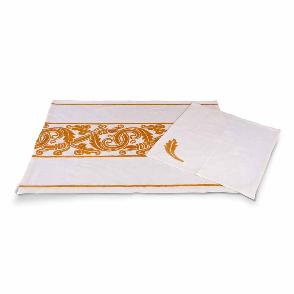 Håndværkerig morgenmadsservice (placemat og serviet) lavet af rent linned med kunstnerisk tryk på håndindrettede antikke stoffer, fås i tre varianter, et unikt kvalitetsstykke fremstillet i Italien.