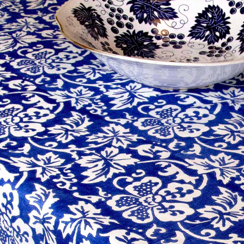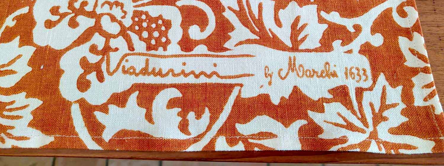 Italiensk dug i høj kvalitet i rent linned, helt håndtryk i blå eller rust med træforme med et kunstnerisk design af et rosevindue, et unikt og kvalitetsstykke fremstillet i Italien.