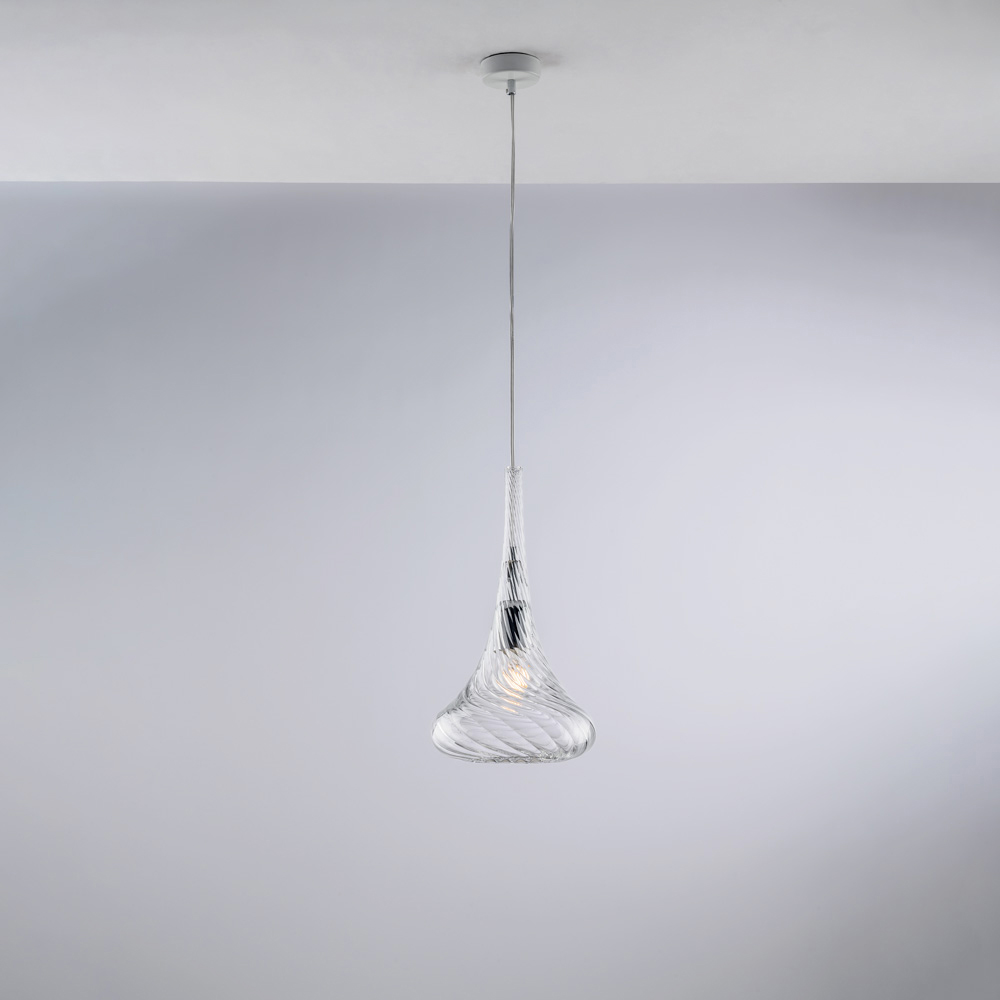 Denne håndlavede jernpendel med Pyrex-glas er enkel og elegant og er en belysningsløsning med et rent, moderne design, perfekt til dem, der elsker lyse og raffinerede atmosfærer. Den enkelte Pyrex-glasdiffusor med sin bløde og let udsvingte form spreder lyset jævnt og skaber en delikat og imødekommende lyseffekt.