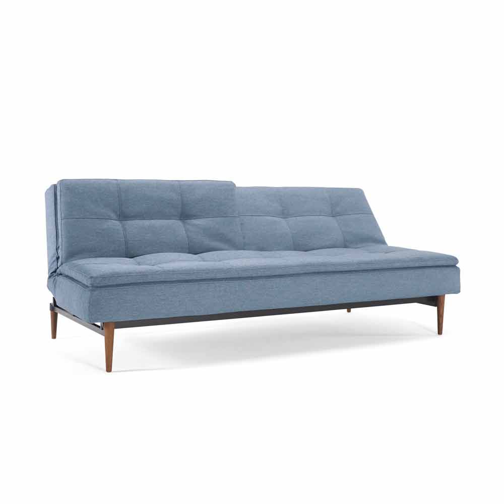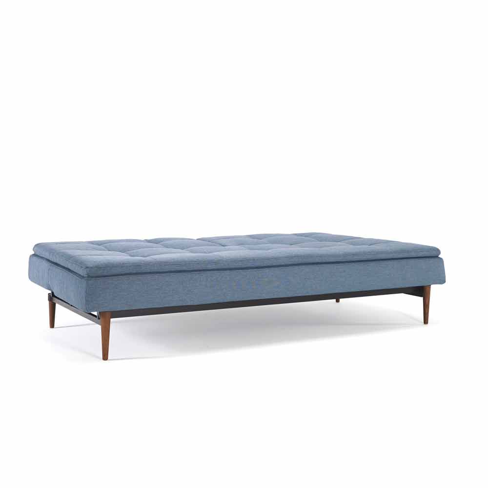 Blå sovesofa med skandinavisk design justerbar i 3 positioner Dublexo fra Innovation, fødder i mørkt træ, mat sort struktur.