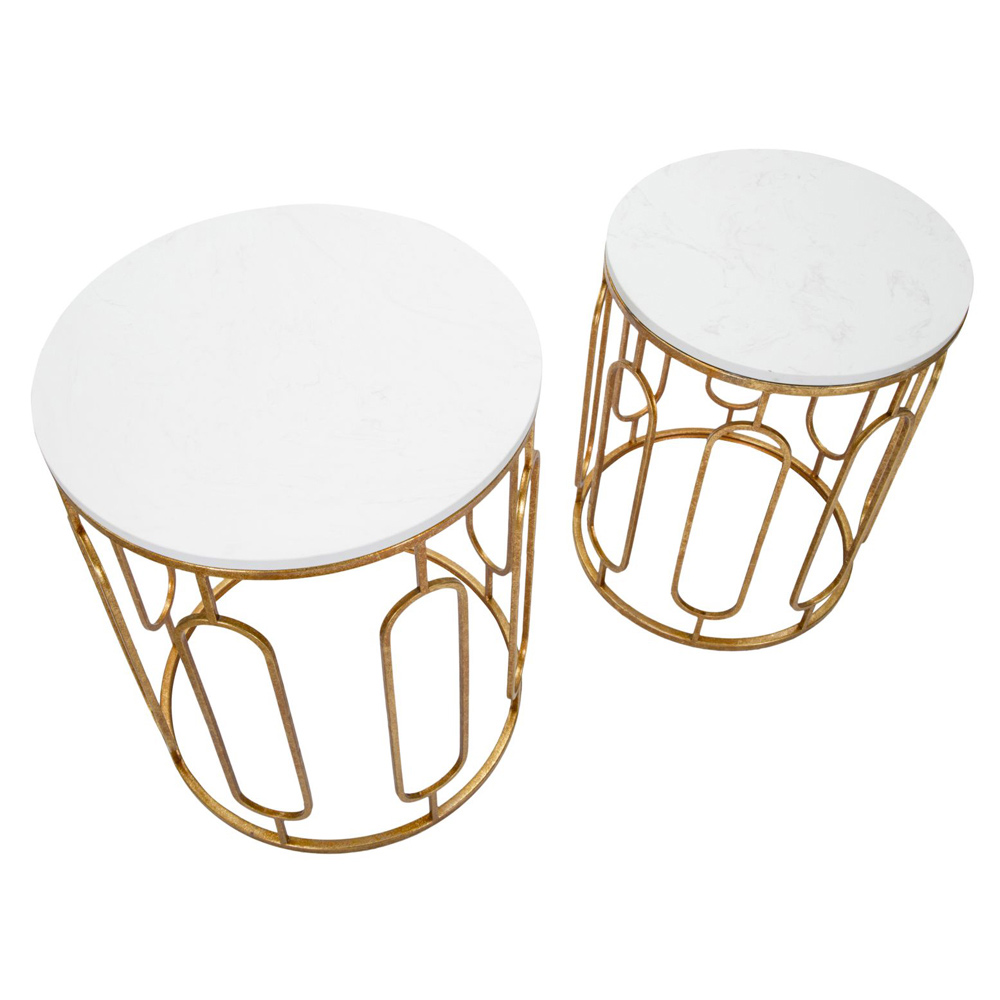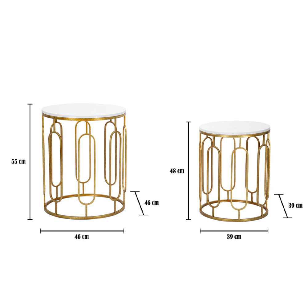 Et par sofaborde med jernstruktur i gylden finish og rundplade i
