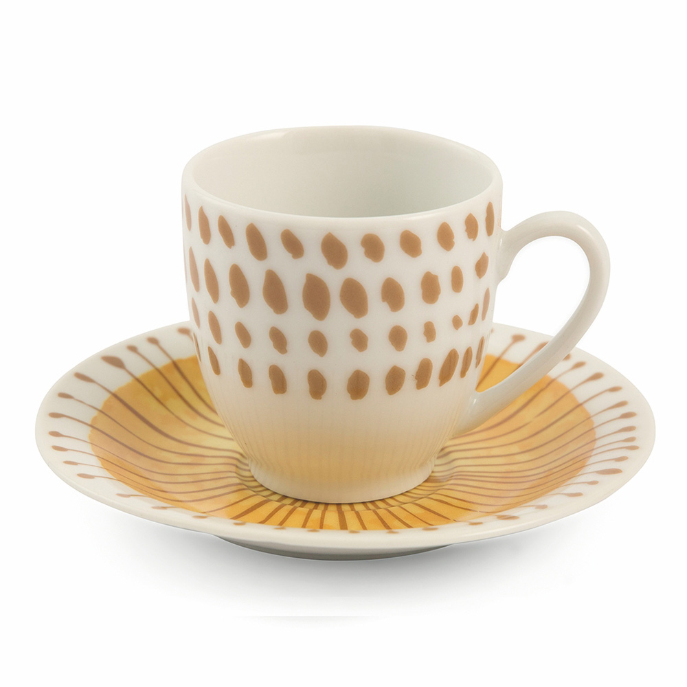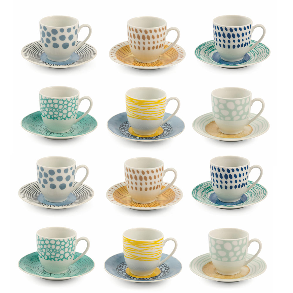 Kaffekopsæt i farvet porcelæn med dekorationer og underkopper, 12 stk.