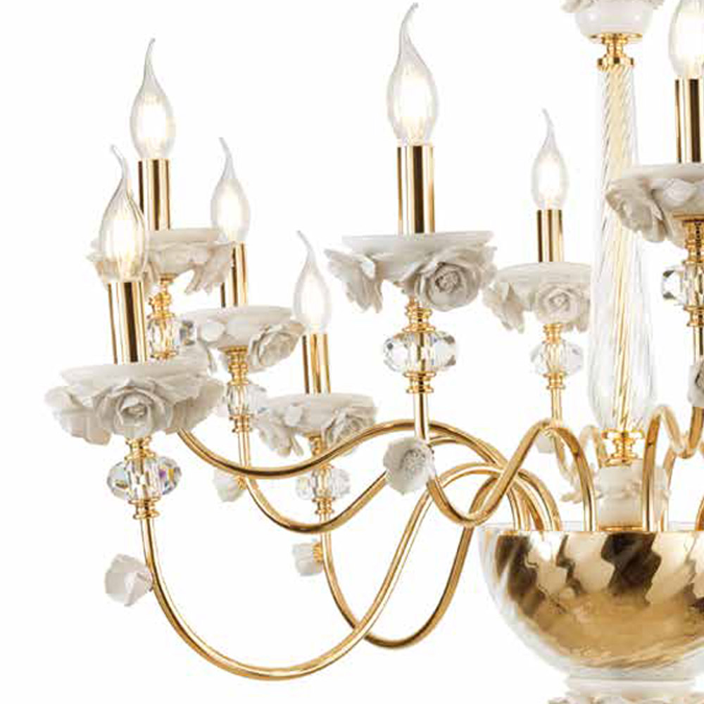 12 lys lysekrone i porcelæn og blæst glas, luksus fremstillet i Italien.