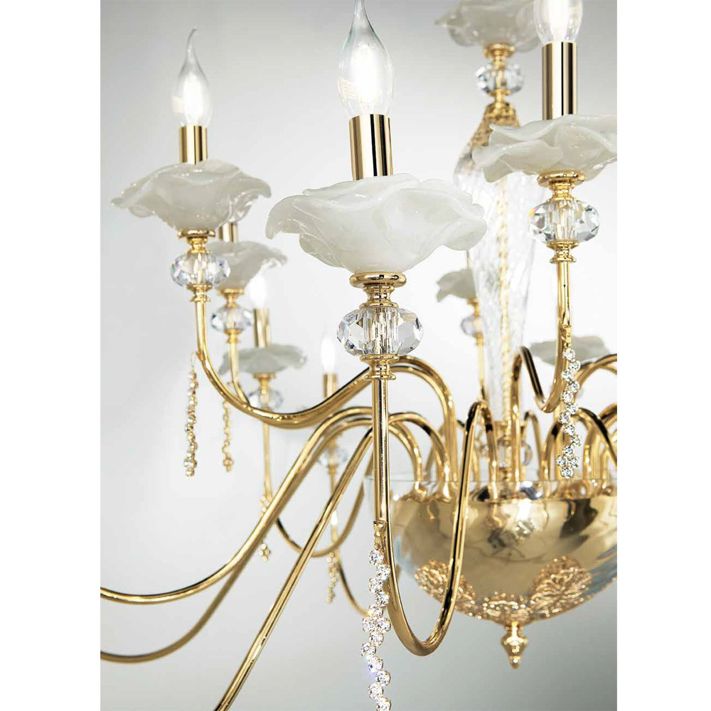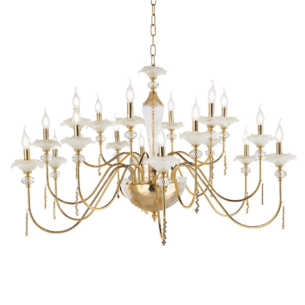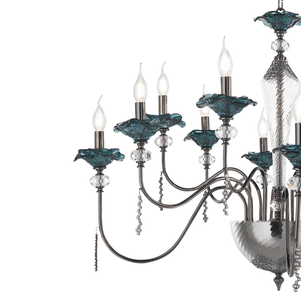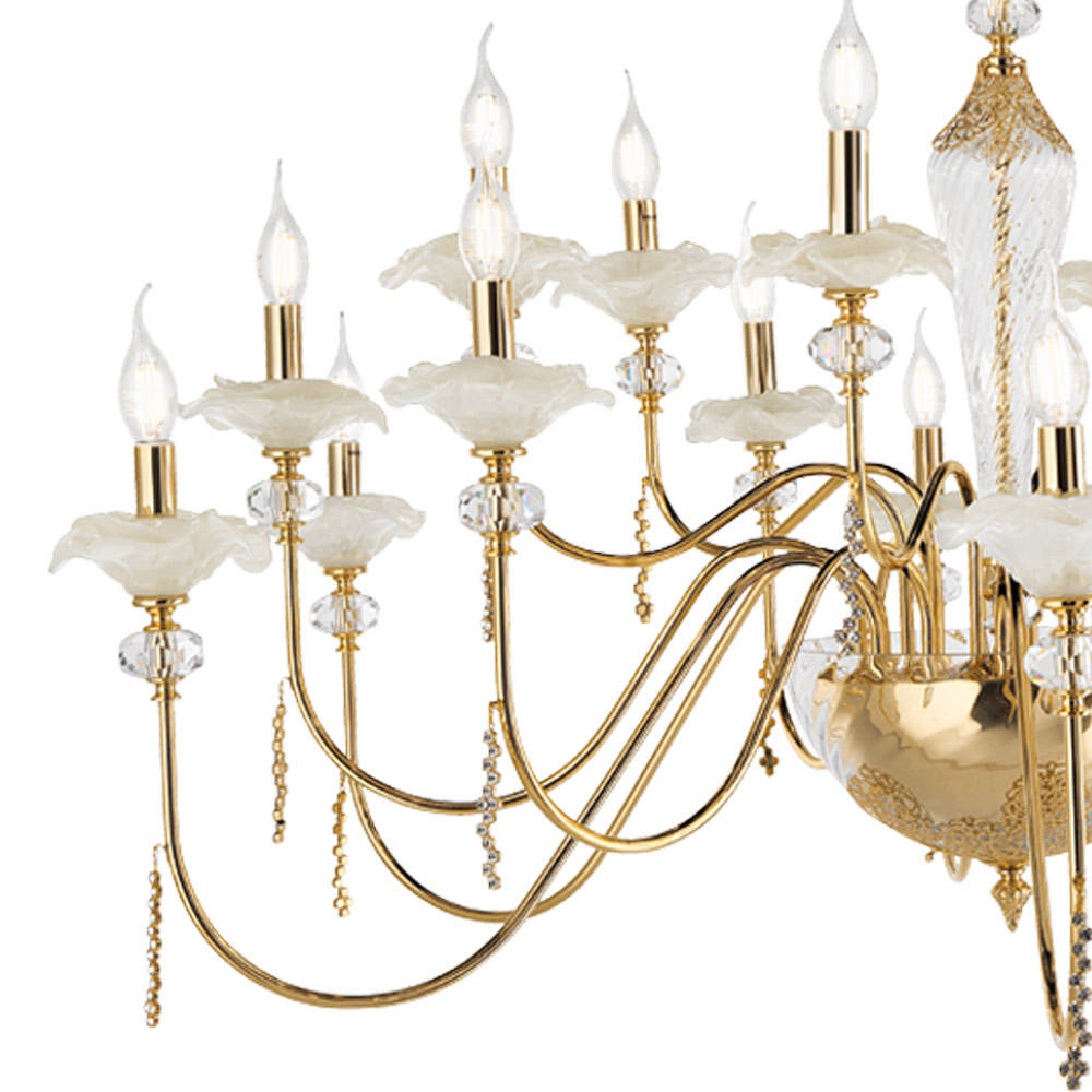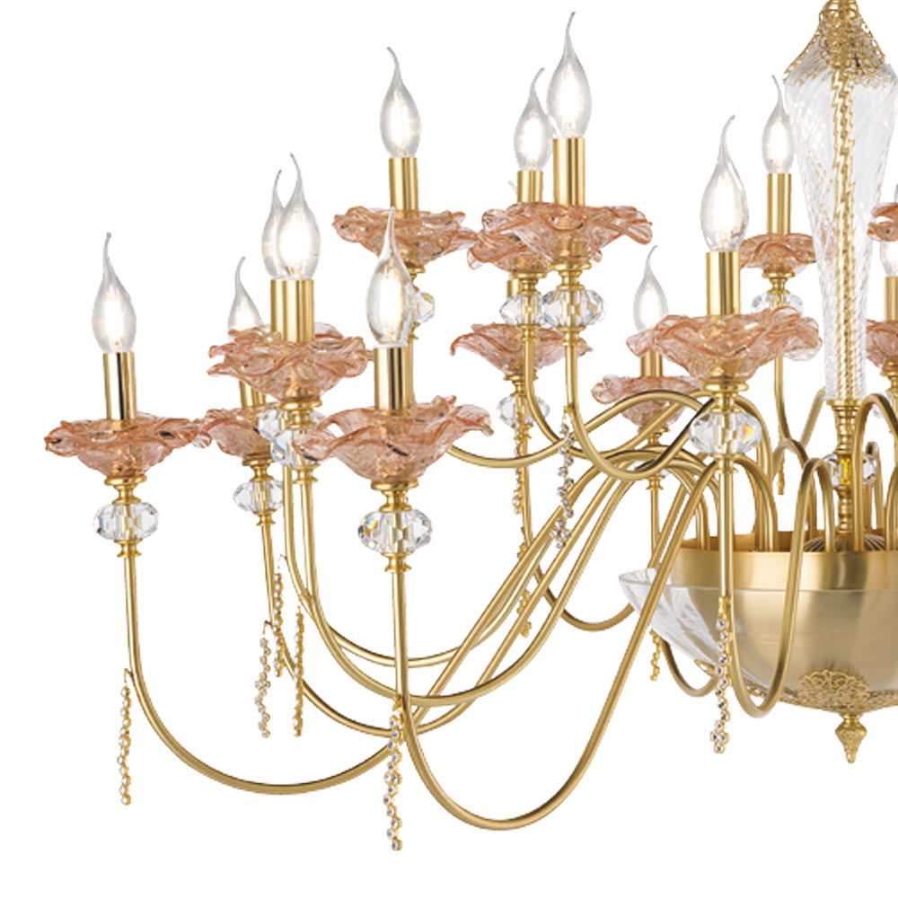 18 lys lysekrone i håndlavet glas med knopper og krystaldråber, luksus lavet i Italien.