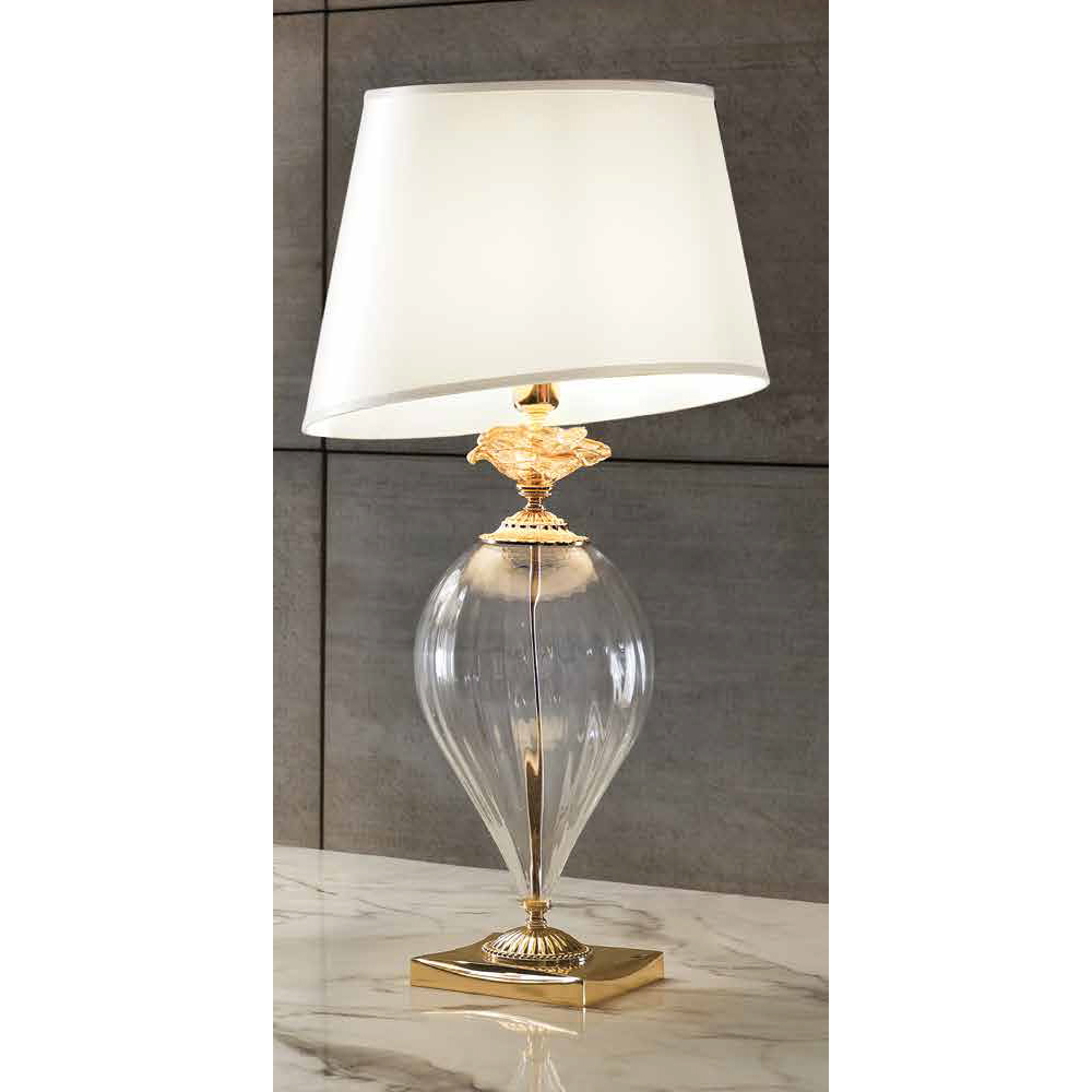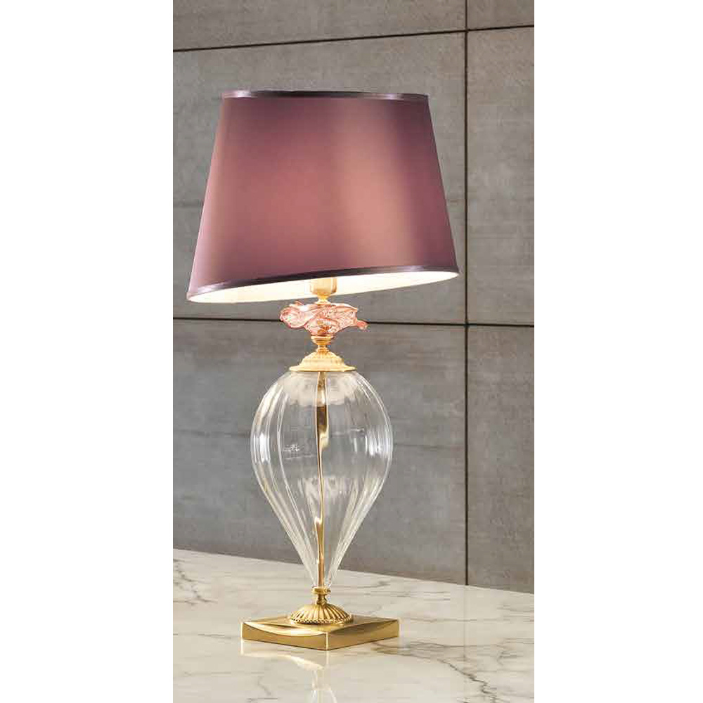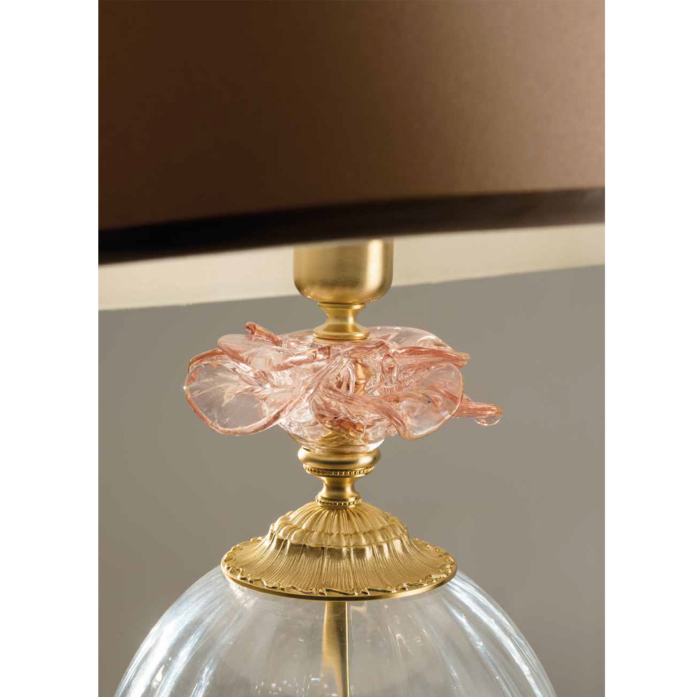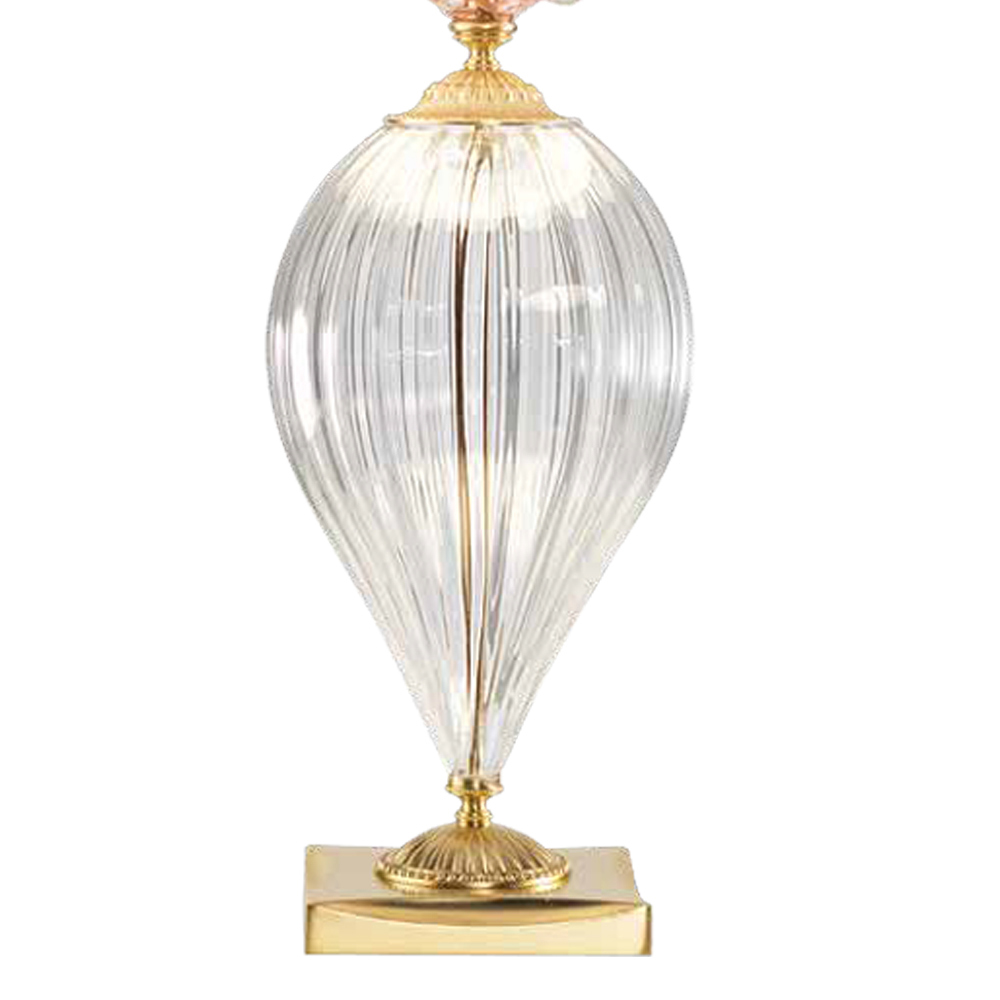 Tilgængelige finish:- Krop i gennemsigtigt glas - detaljer i roséglas - satin guld metal og champagne lampeskærm;