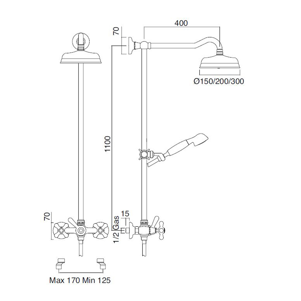 duplex-brusegruppe med glidestang, fleksibel slange, håndbruser, arm og brusehoved i 3 forskellige størrelser er helt