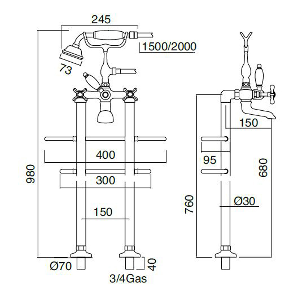 gulvmonterede badekarssæt med håndklædestang, håndbruser og fleksibel slange è helt