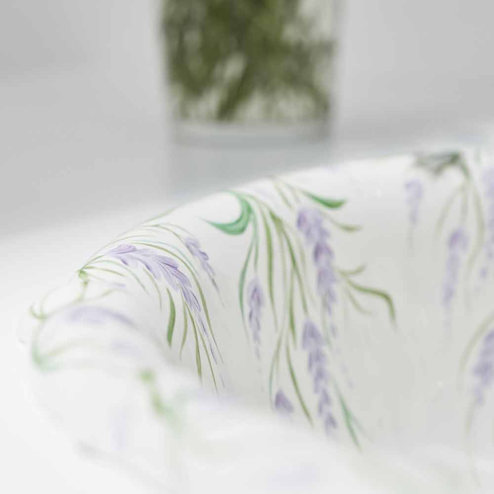 Indbygget badeværelsevask lavet i Italien i tyndt hvidt porcelæn med indvendige udsmykninger af små lavendelstænger håndlavede med børsteknikk.