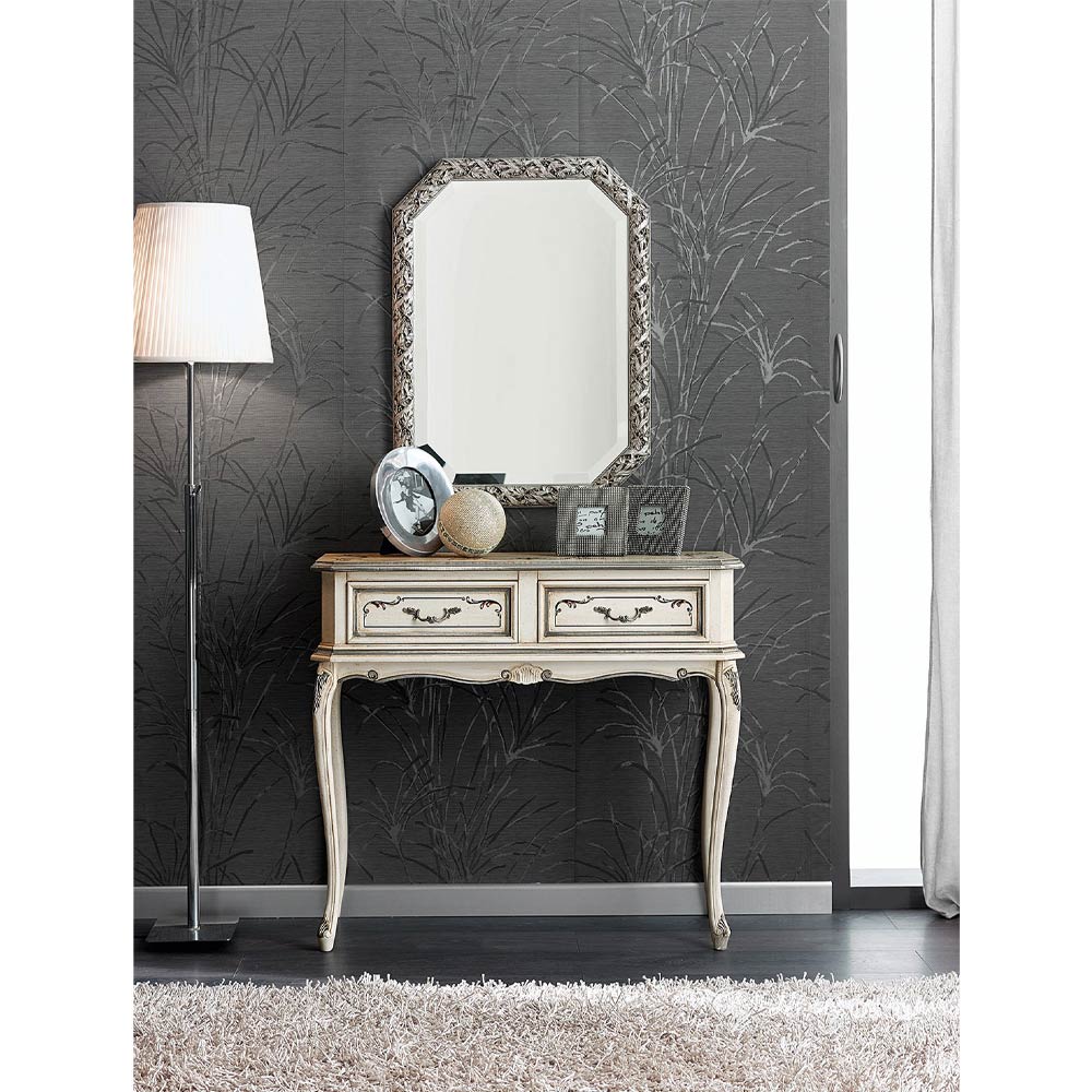 træ , tilgængelig i Bassano valnød eller hvid og sølv finish. Dette praktiske og raffinerede møbel har to praktiske skuffer og er fuldstændig