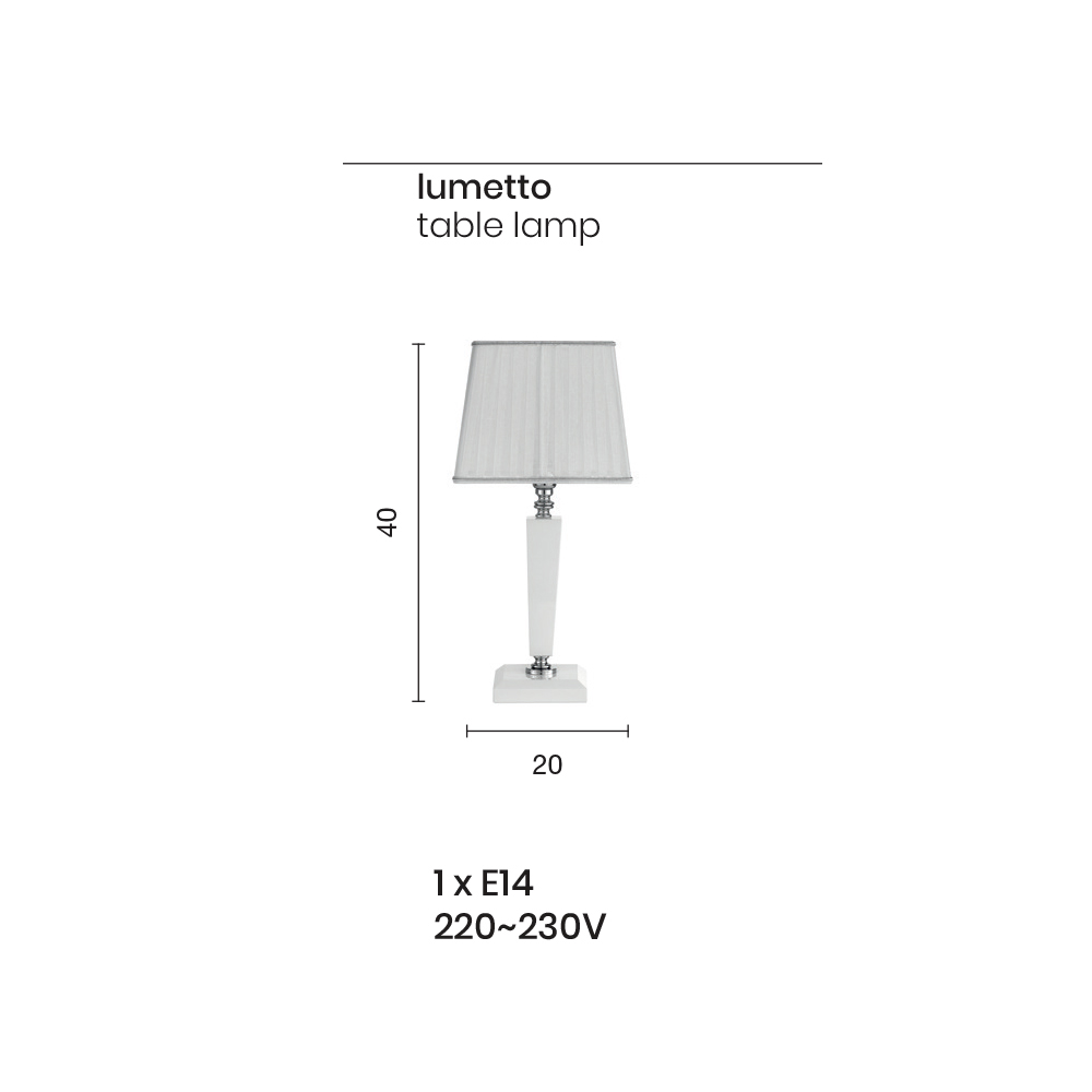 Denne bordlampe er i stand til at karakterisere miljøet og består af en hvid firkantet fod , to firkantede elementer i håndlavet hvidt glas og en hvid stoflampeskærm med plisseret effekt.